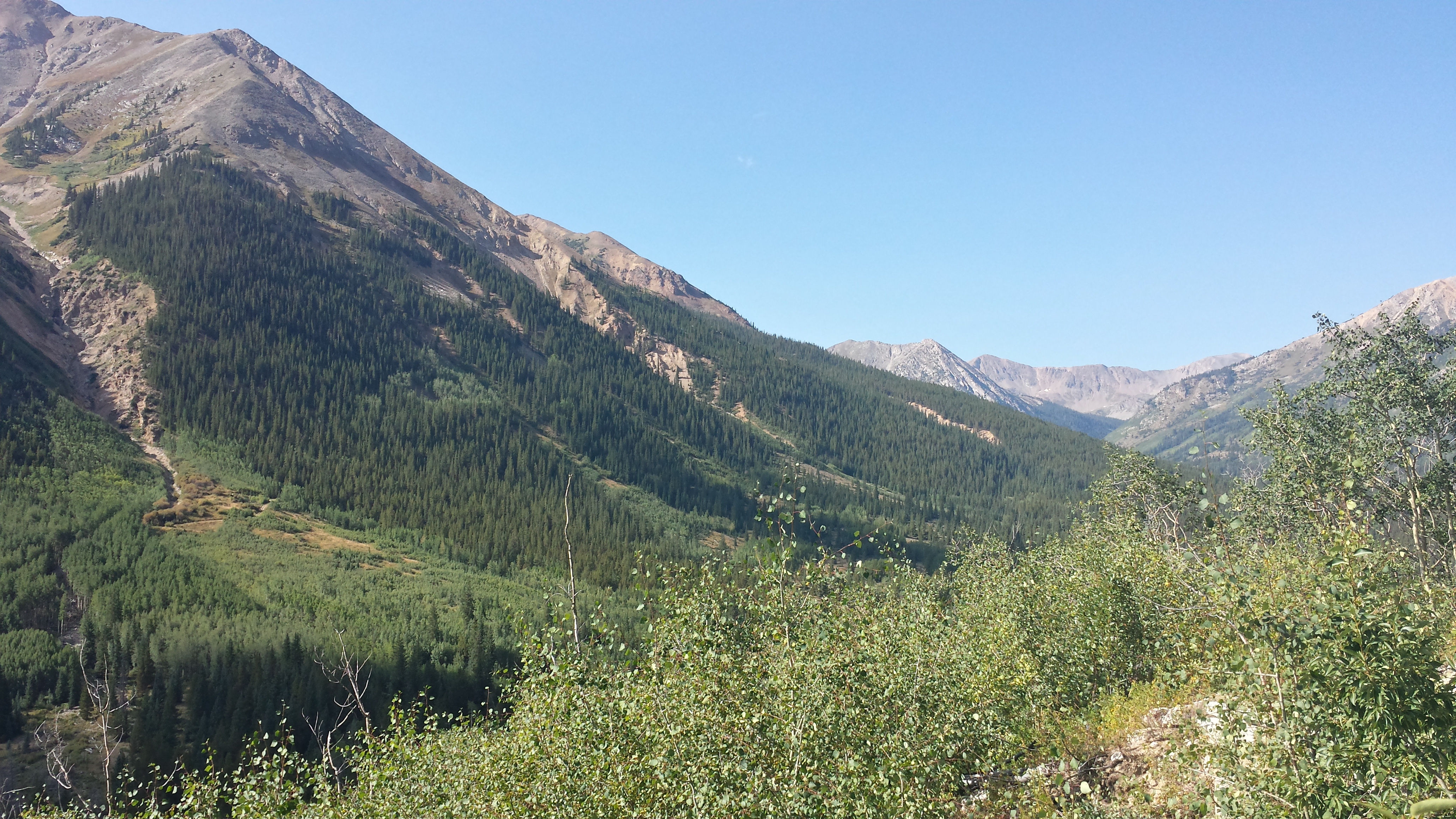 Then it’s over the gulches and through the aspens, to the long jeep road walk we go– except when we get to the jeep road, there are signs for the trail beckoning us not left, down the road, but forward. We’re off the map, but instead of dragons and monsters, we find beautiful, brand new trail, up off the road. To top it off, we won’t have to ascend as much as we would’ve otherwise when we get into the Collegiate Peaks wilderness. We see other hikers on the road below, and the ghost town, Winfield, that I would’ve liked to look around, but all in all, the new trail’s definitely a win to me.