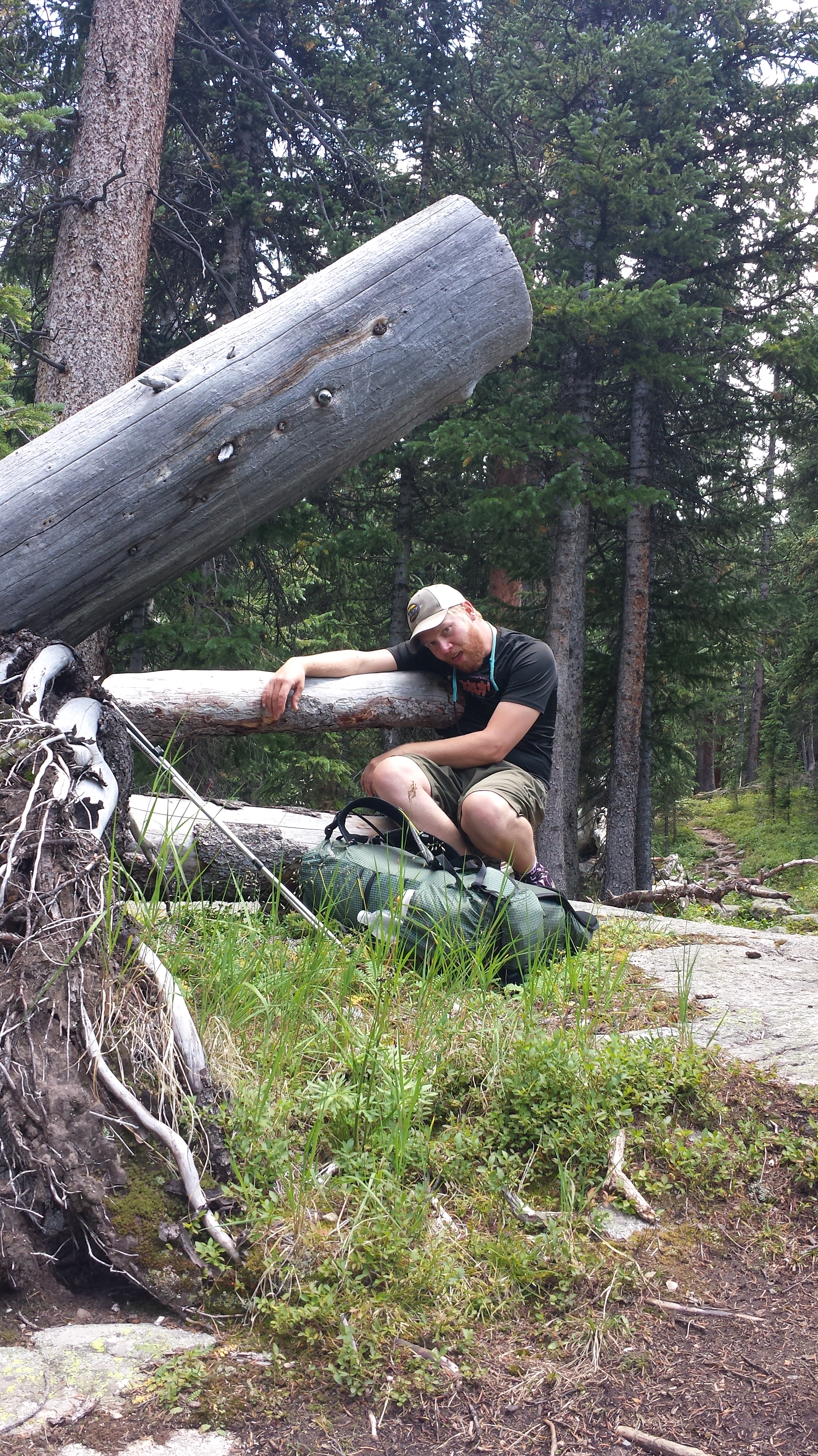 Then it’s a nice down, to the pips of the pikas, all the way to the edge of the Collegiate Peaks Wilderness. The path splits here, with both forks looking legit, and while the Timberline Trail should be coming up, there’s no signage: my guess is to go straight, Speshul’s is to go left. We drop our packs to consume calories and I decide to take my snack to go, check out the straight path. I dead end, not two minutes later, onto the Timberline Trail, where I imagine I cut quite a figure to the four dirt bikers motorcyclists there: no pack, ripped-ass shirt, munching on a Snickers. I’d probably look lost if not for the confident nodding. I haul a left, imagining I’ll run into that side fork, and sure enough I spot Spesh in the trees still eating; it’s a shortcut, but the whole thing’s probably taken all of five minutes. So much for Leave No Trace principles.