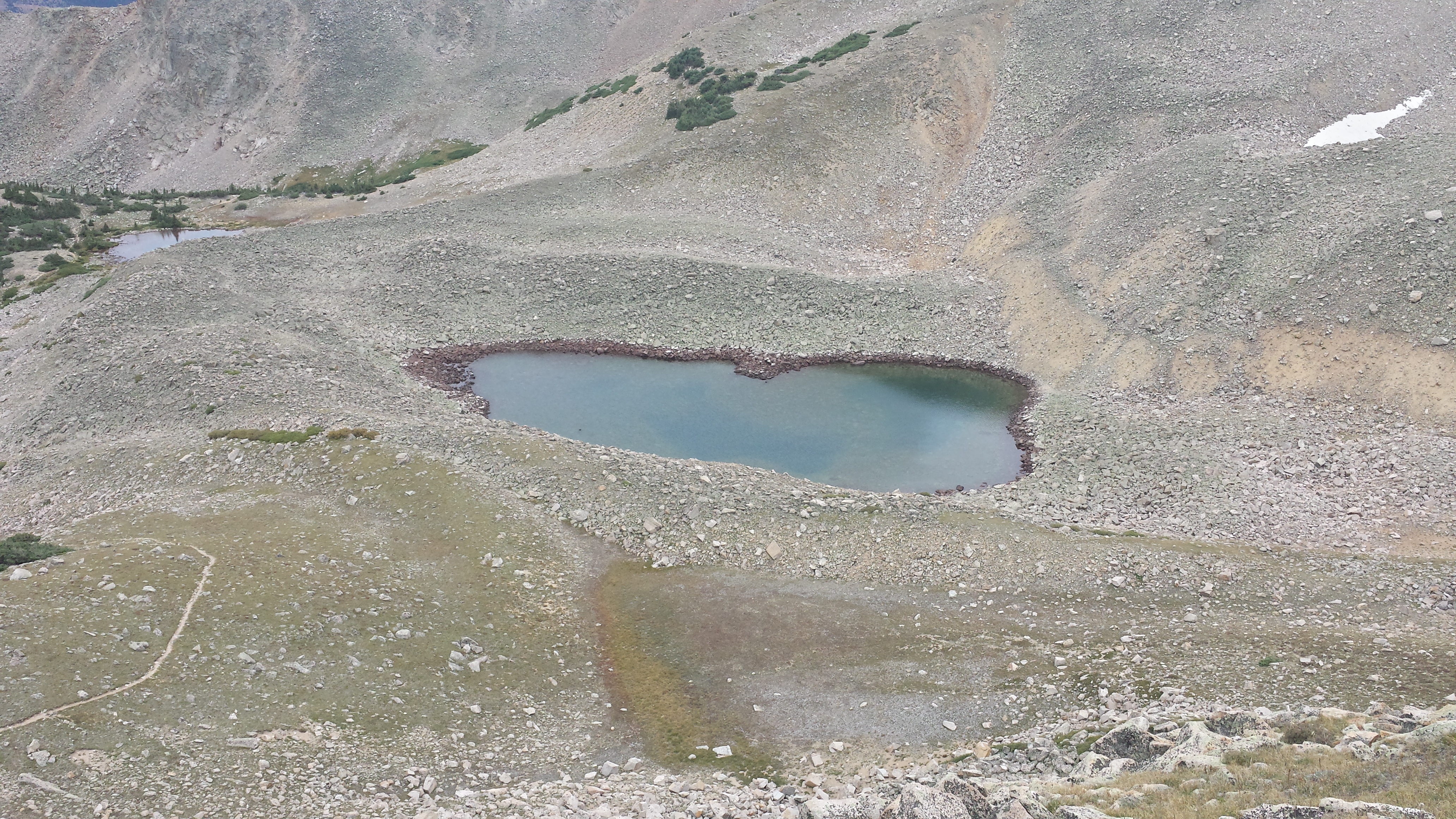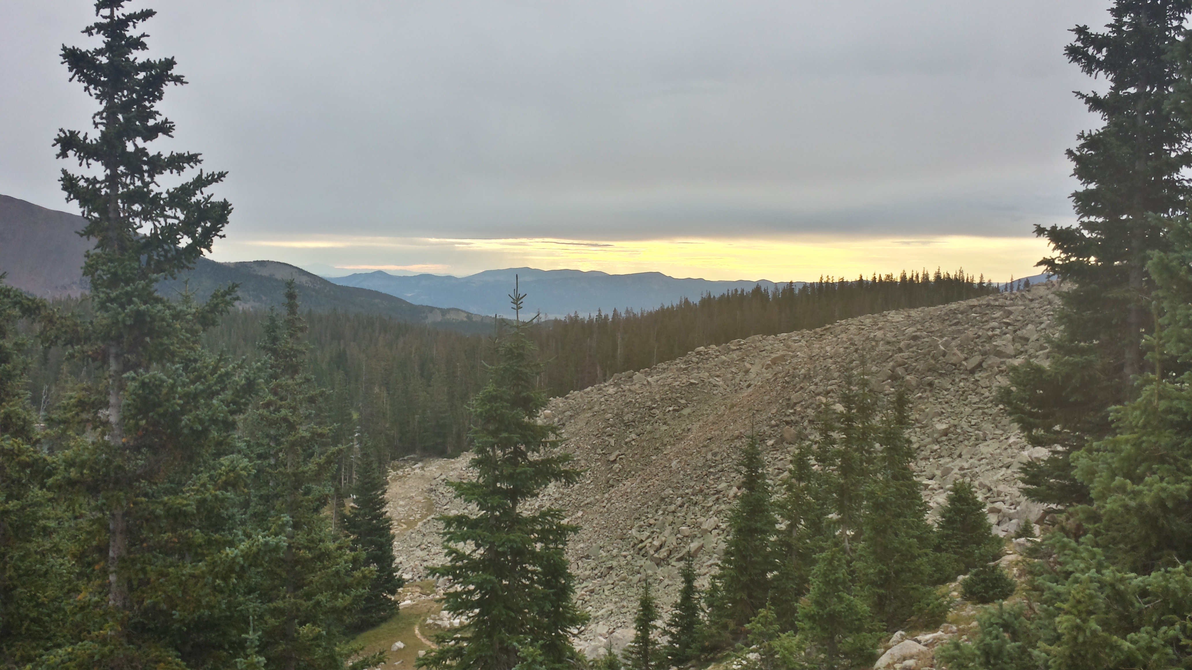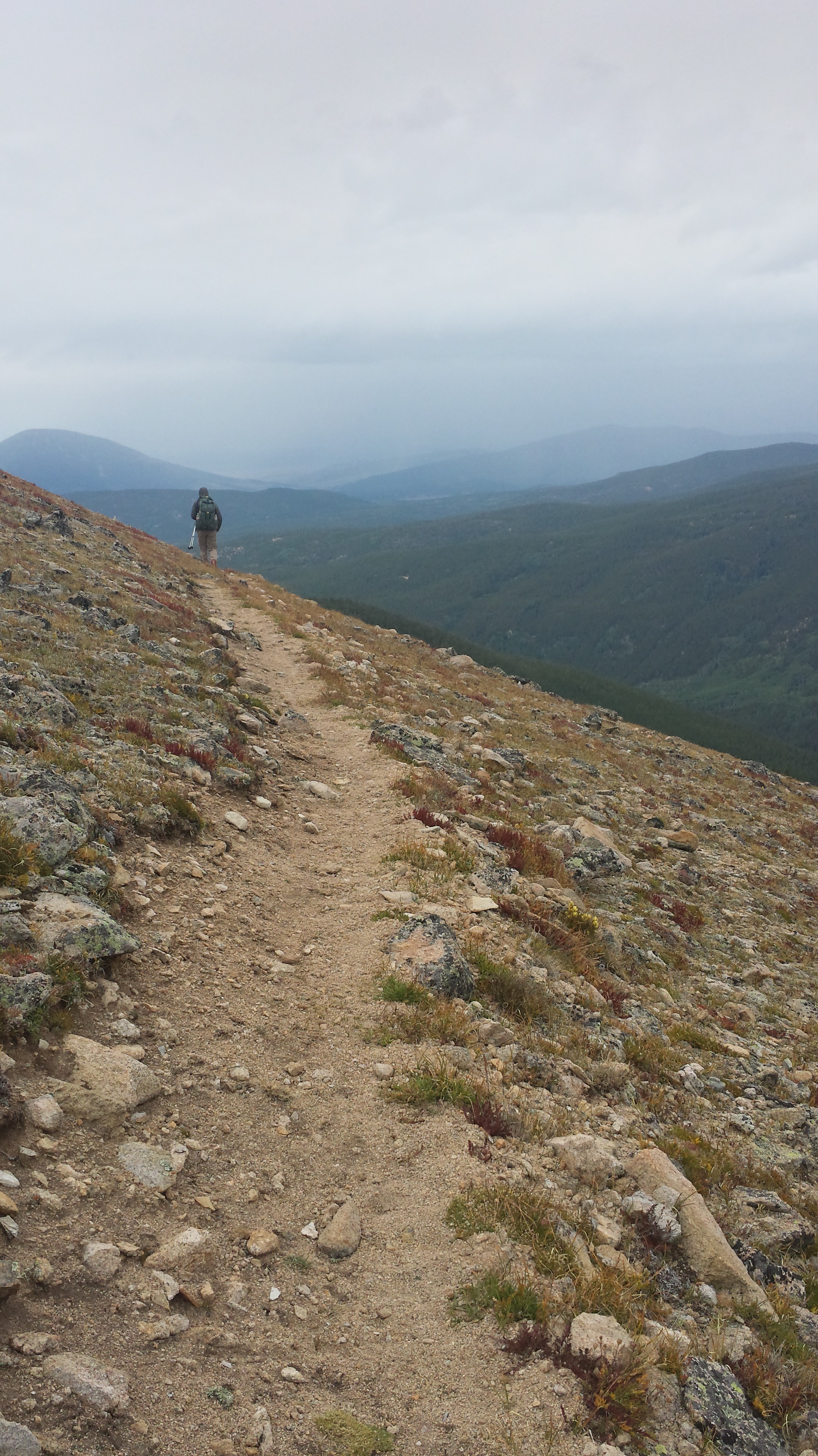 …for about thirty seconds, before Spesh encourages me to look around: dark clouds and rain off to our east, dark clouds and rain off to our west, ahead of us, a ridgewalk lasting miles, aaaand right on cue, a rumble of thunder. Spesh politely recommends we haul ass and not take breaks until we get a little lower, urges me to keep up, starts off at a grueling pace that, god knows how, I’m able to match.