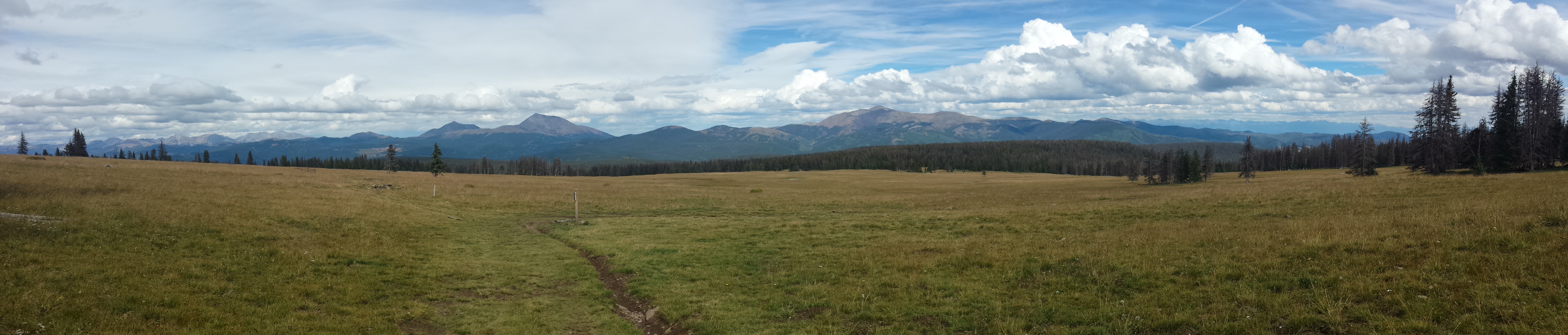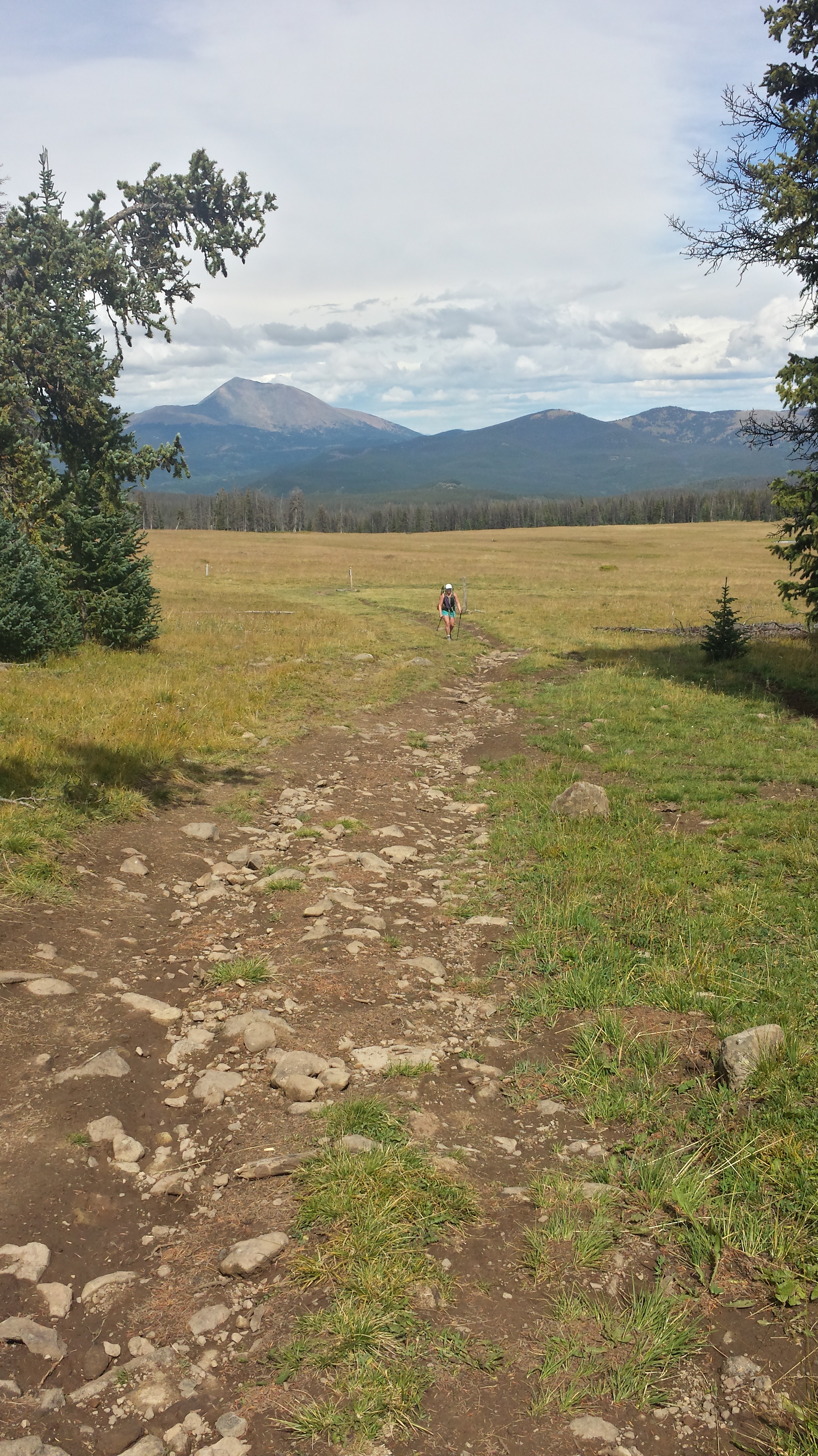 We run into four Northbound CT thruhikers on our crossing, two of whom mistake us for CDT hikers2 and two of whom are my Buff buddies – we’re all wearing the same Buff. Crank, having slowed down to share the moment with me, chuckles at all of us, and at the number of shoes one of the NoBos is carrying3. They say there’s a yurt ahead that’s not to be missed – running water and a woodburning stove and such, just past Lake City. That’s still a ways off, so I put it from mind, take some more pictures as we leave the mesa.
