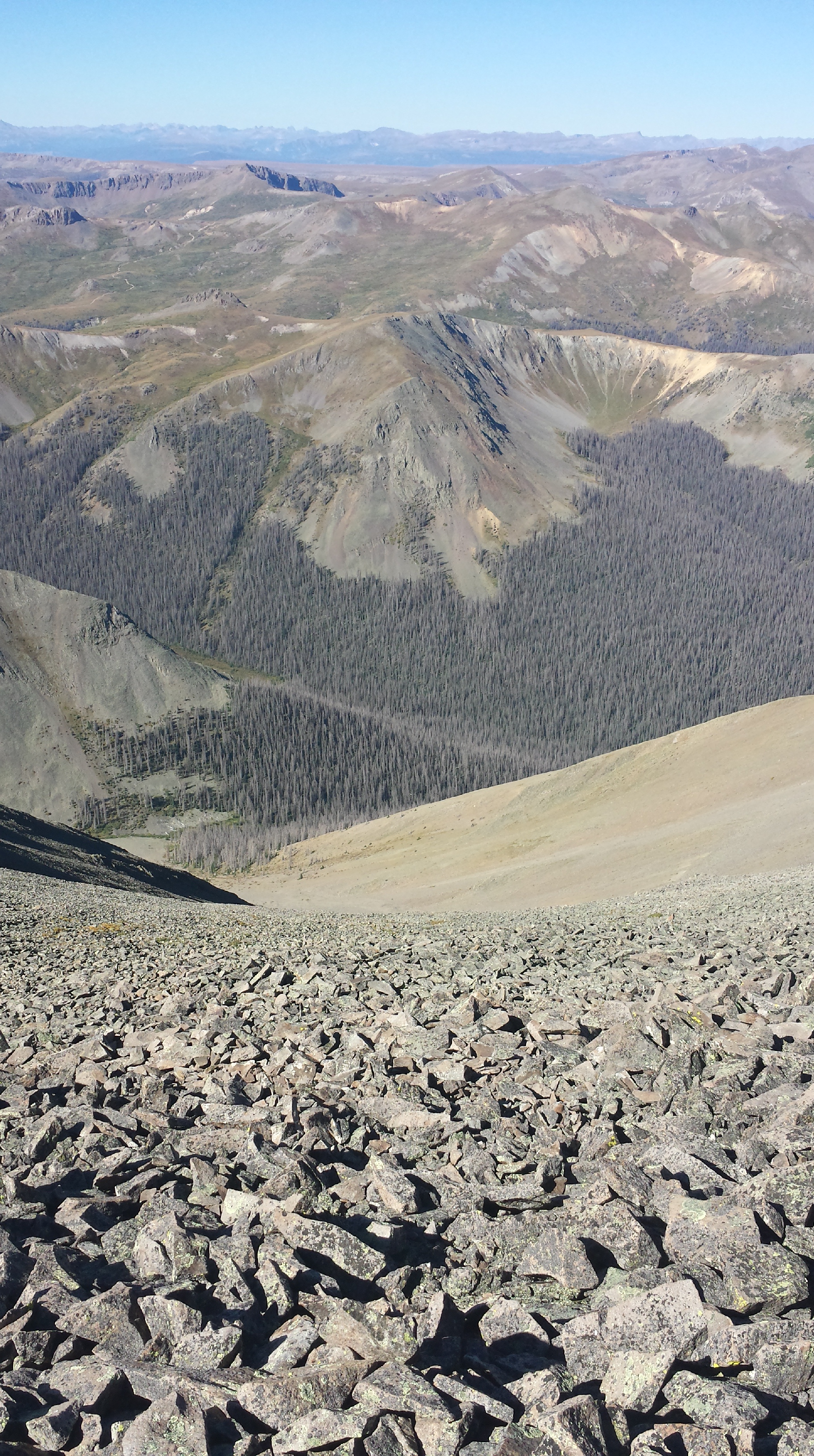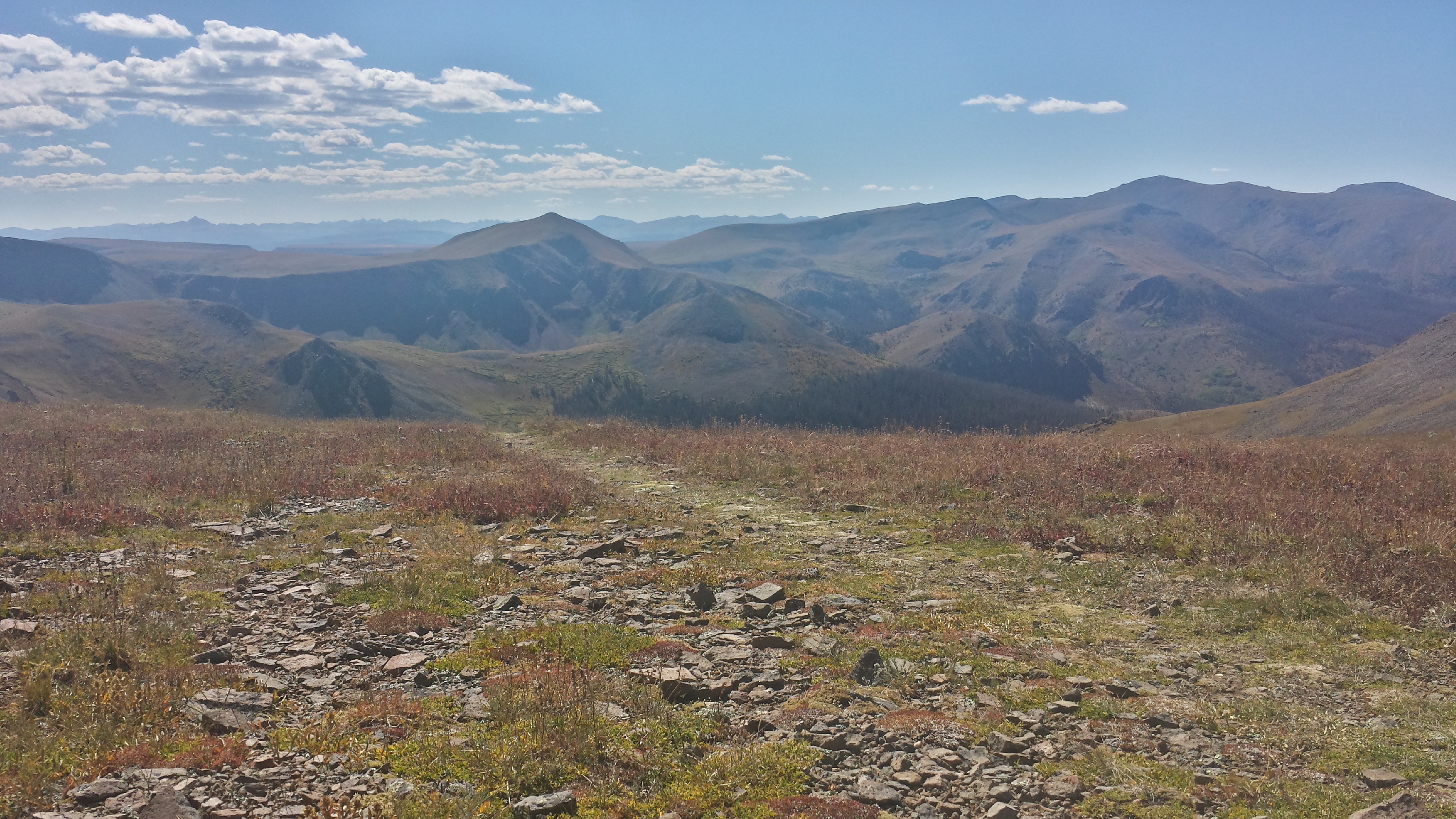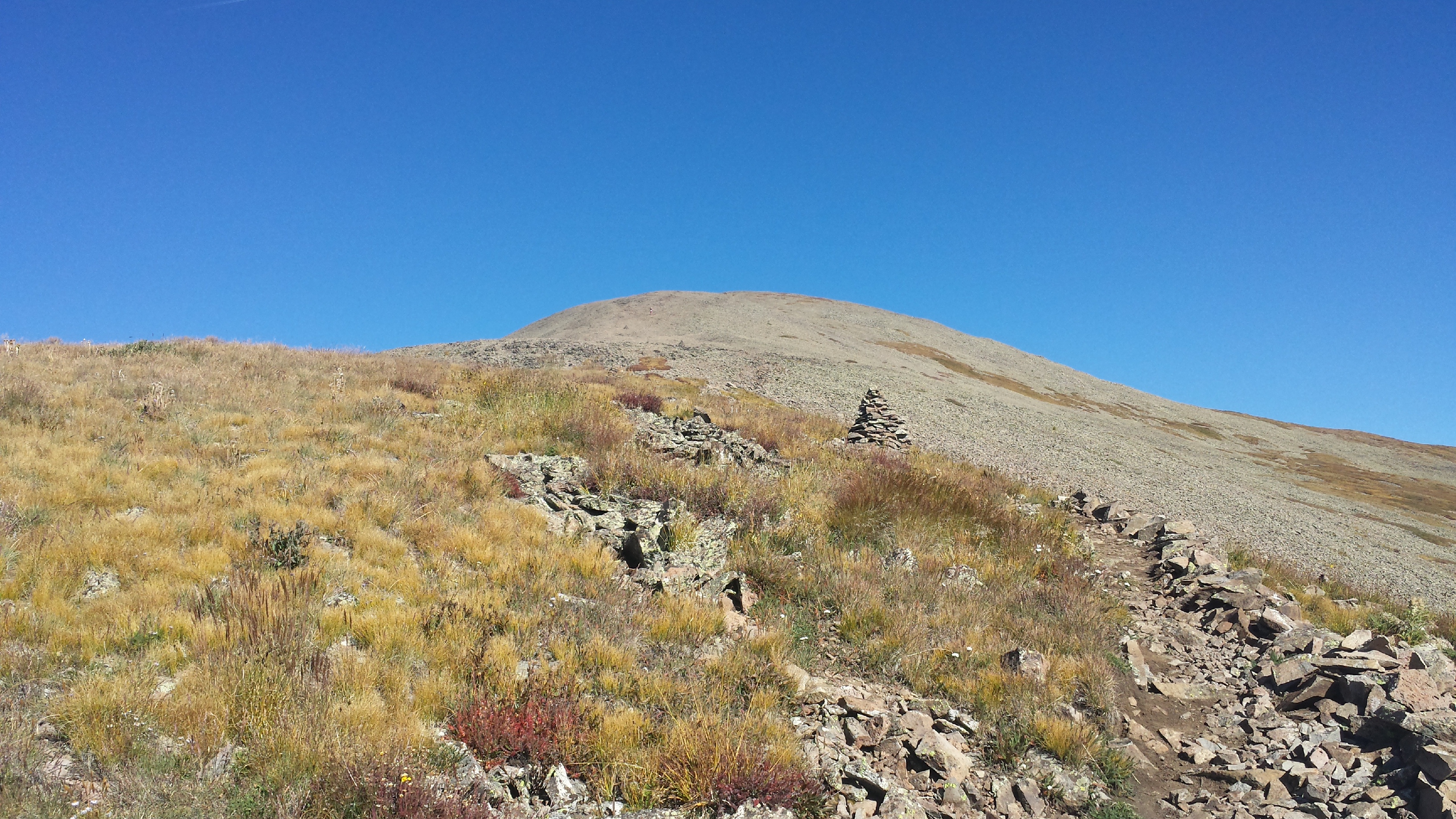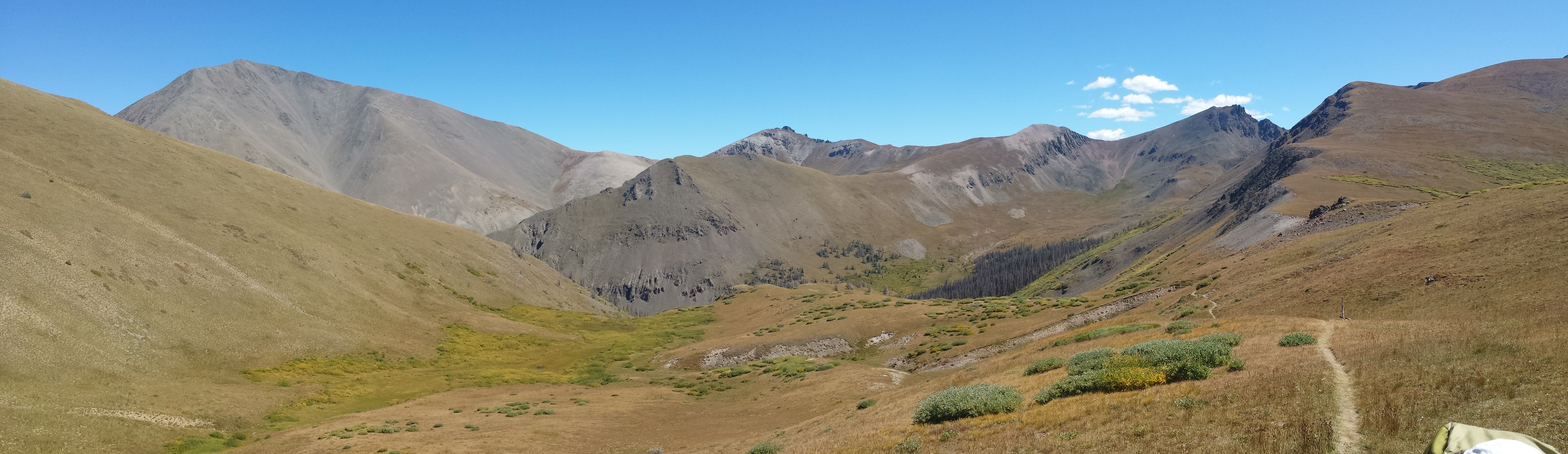 We wake to a light covering of frost on our tents, morning seeping into the valley around us. Today’s the day. My first fourteener. Period. End of story. I’m doing it. The sun’s shining, the LATS1 weather report is clear, it’s nice and early, we’re camped less than a mile from the saddle – everything’s perfectly set up. I just have to get up about 900 feet in a mile to the saddle, and then another 1400 feet in a mile and a quarter to the top.