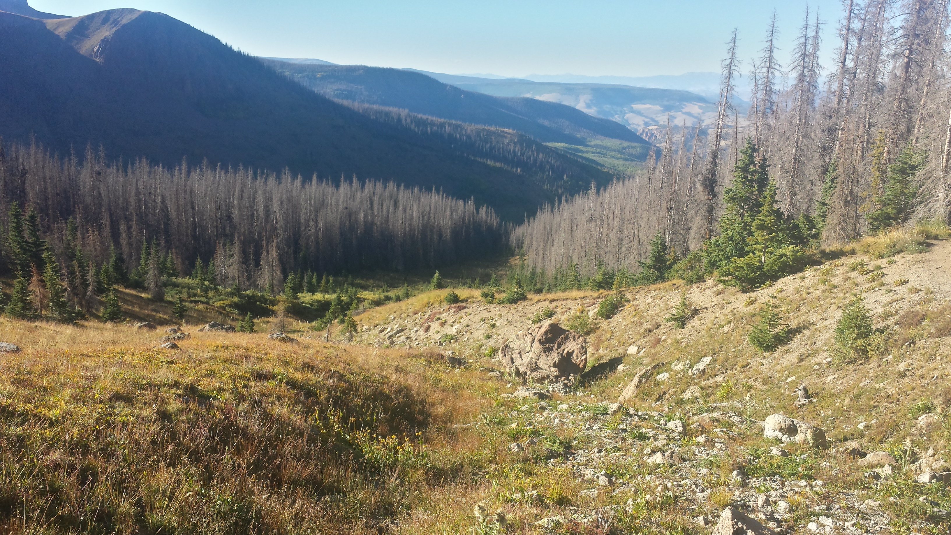I’m feeling particularly slow-moving this morning – I don’t know if it’s avoidance or exhaustion – and NoDay has less to pack than I do, so she’s up and out and ahead with him, looking to meet us at the saddle. Crank and I start off at the same pace, chatting, but she quickly moves ahead, powering up the hill, and I plod plod plod along behind, worries for the next climb growing greater in my mind.