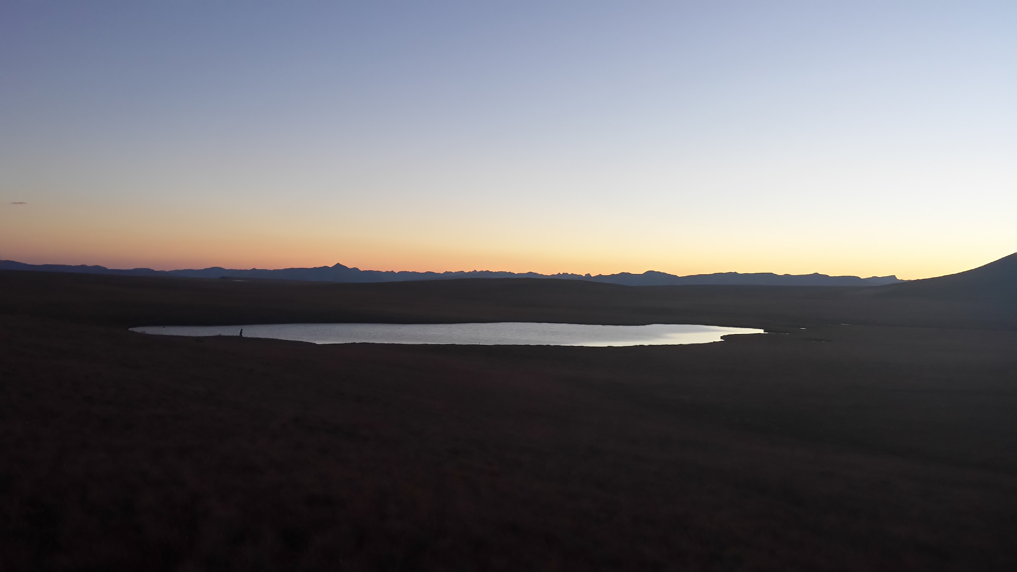 Snow Mesa’s beautiful in the setting sun, and we hit the lake we planned to camp at pretty quickly. The water’s full of strange swimming things, though, so we move on to the next water source to see what that’s like.
