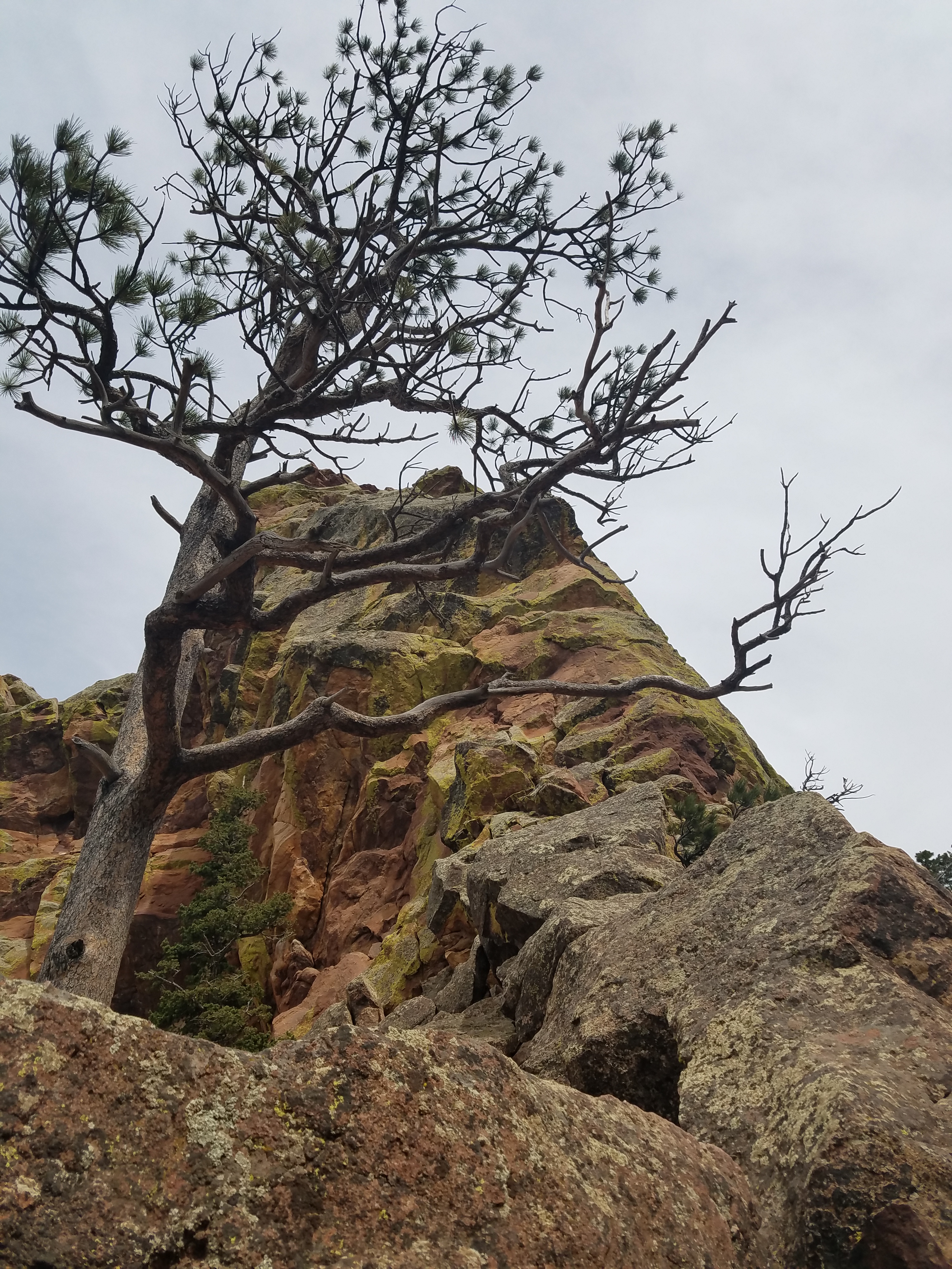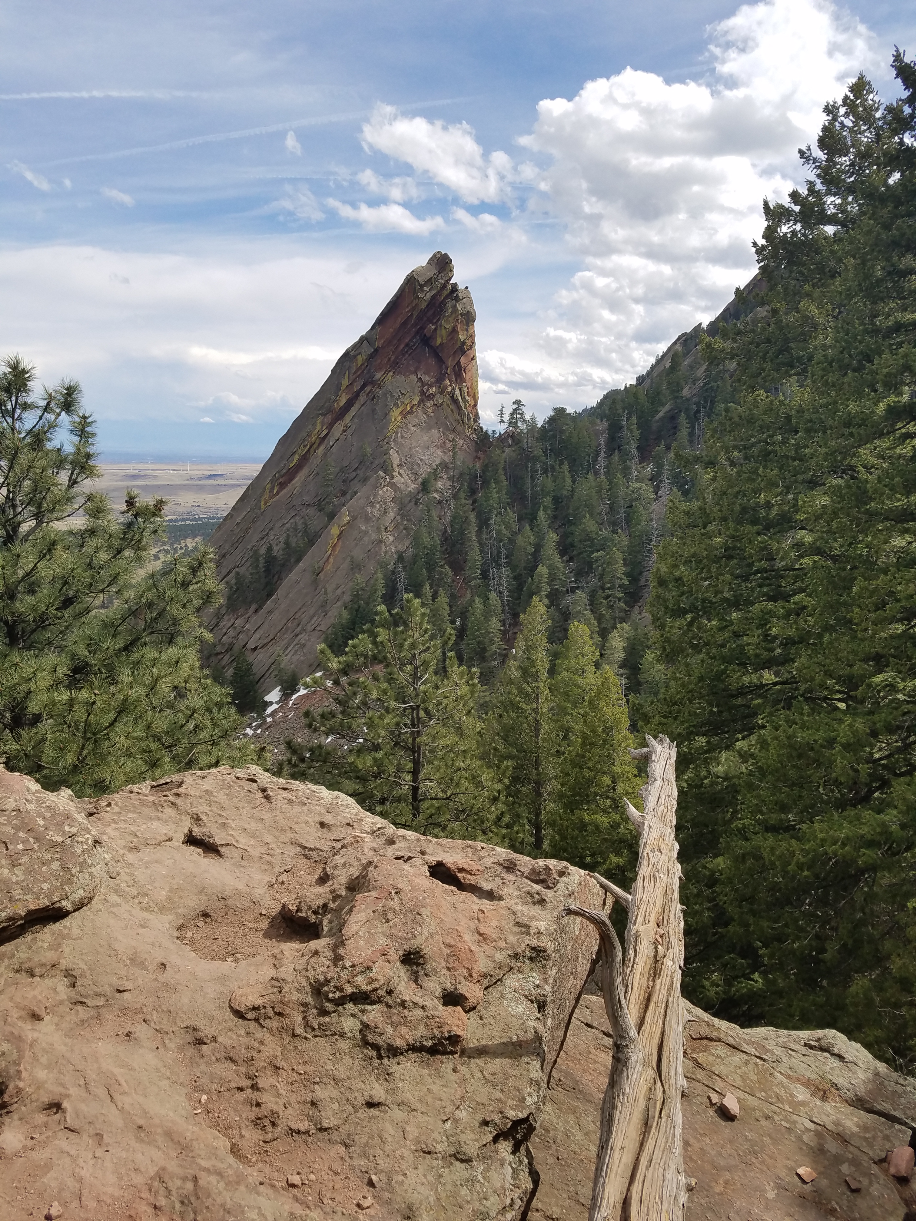 My goal on this short out and back is just to see how my feet handle the new Altras2, remember what my pack feels like on my back, challenge my muscles and lungs, see something mostly new. Chautauqua’s a good place to take out-of-towners who want to see the mountains, so I’ve done about a third of this route before; out-of-towners usually only make it about a third of the way up before, between the altitude and the exertion, they tap out. Still, I manage to get turned around before I even make it to that spot, the first/second Flatiron trail junction. I’m suspicious of the trail’s sudden downward direction, though, so I stop and figure it out before I go more than a hundred paces in the wrong direction.