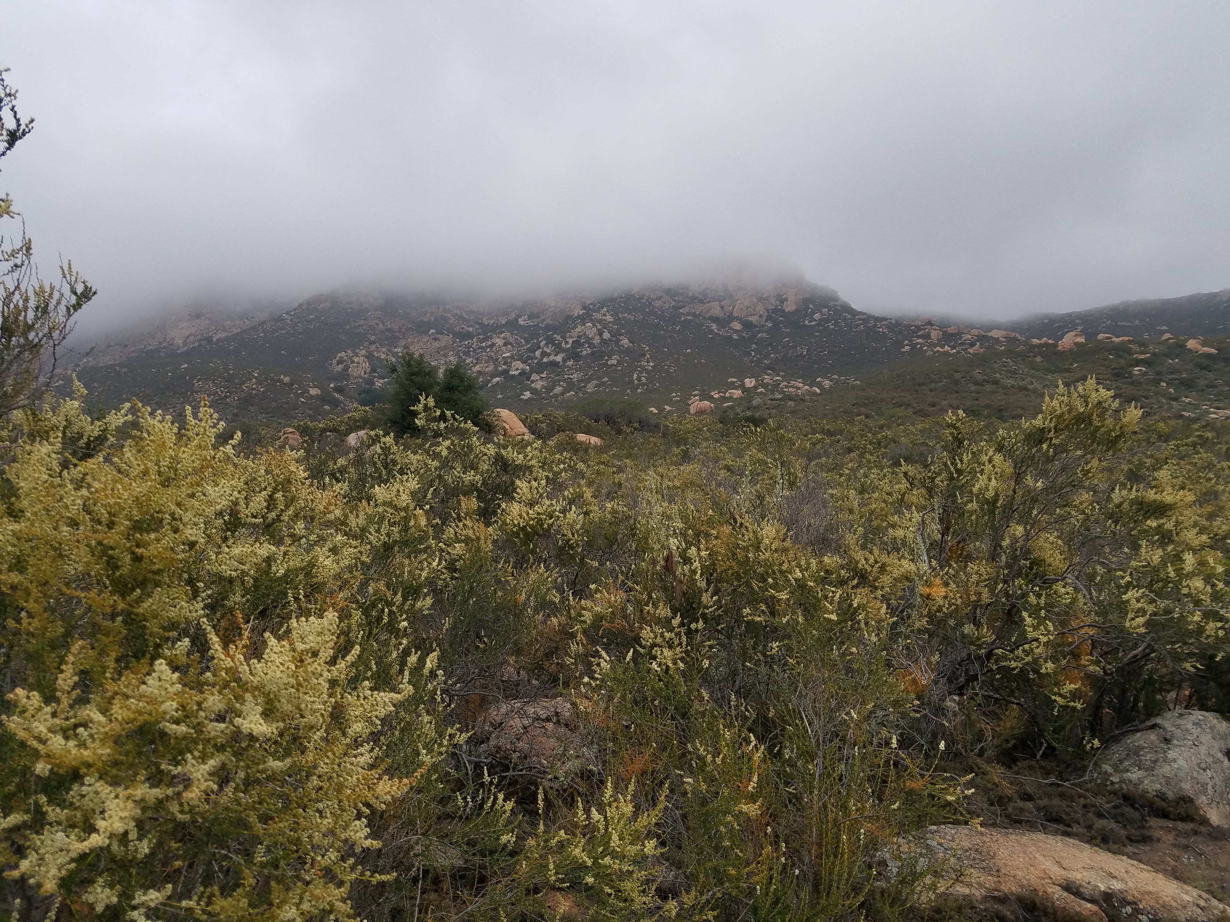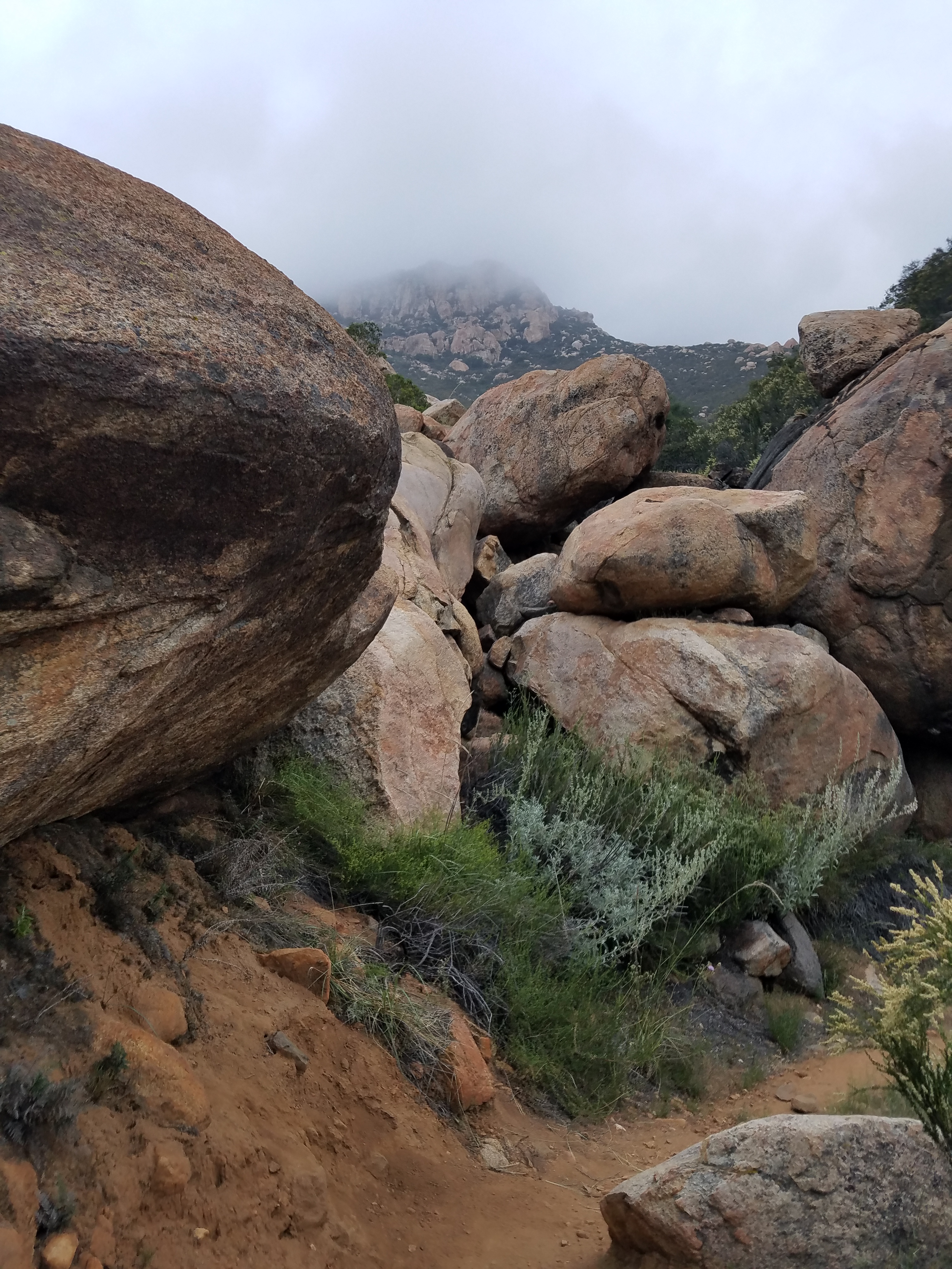 It’s a hazy morning – so much the better for this climb, three miles, a little respite, then a bit more of a climb before the descent into Lake Morena. As I’m climbing it’s way, way easier than I think it should be. The trail is beautifully graded, and even with the clouds there’s something of a view.