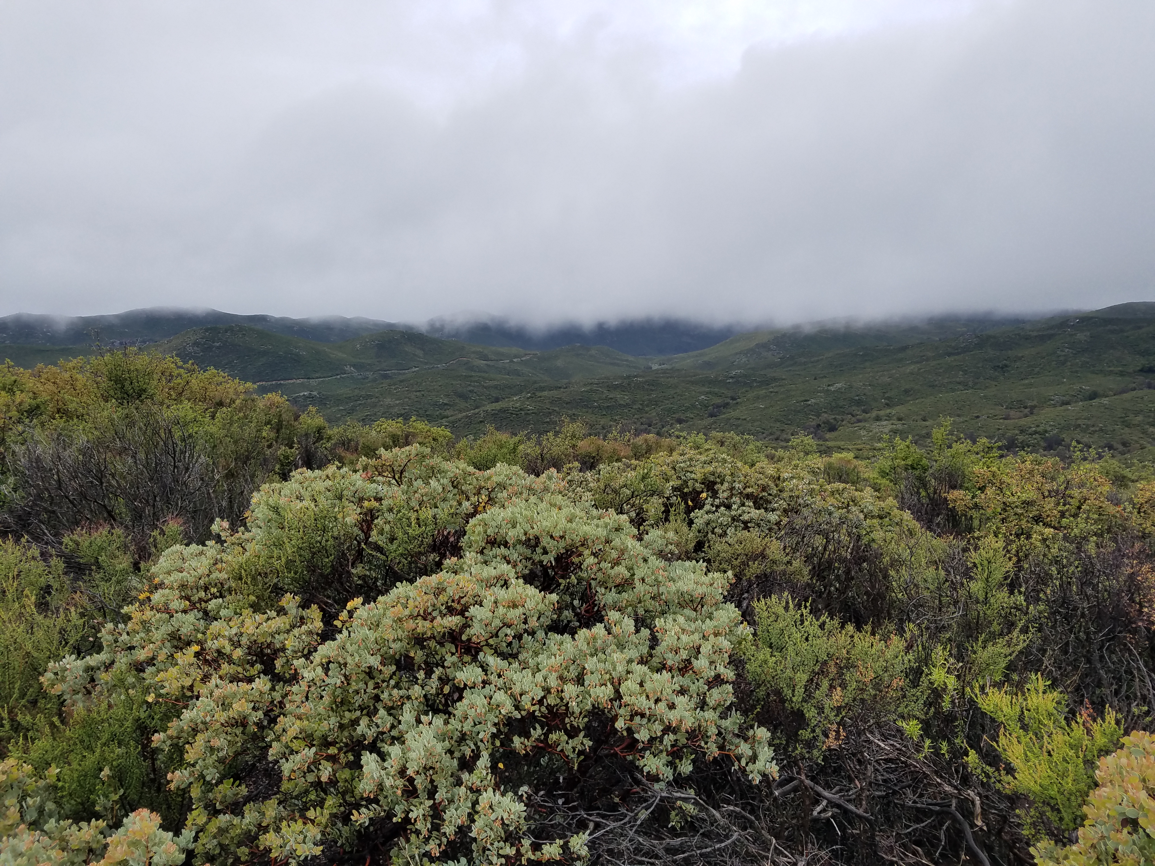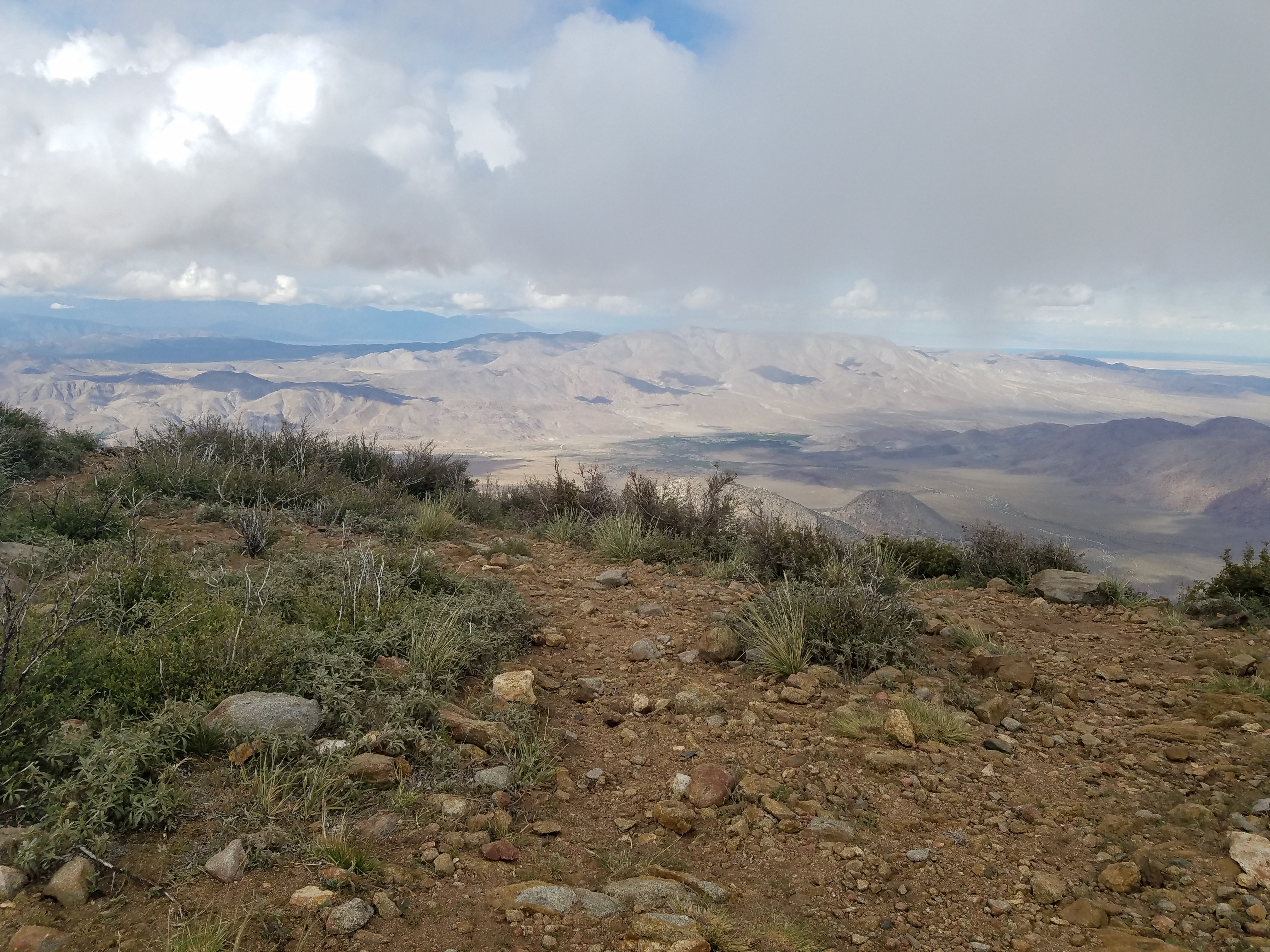 So, sighing, I pack up inside and bundle up against the cold and stuff my feet into wet shoes before dashing outside to take down my tent. It’s a Sisyphean effort to get it completely packed without getting any water inside, so I put it away on the outside of my trash compactor bag, to keep the dry stuff and the wet stuff separate. Then it’s oh-god-get-out-of-camp-or-I-might-freeze, ten miles to the Desert View Picnic Area and Mount Laguna.