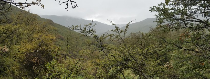 So clearly, it’s gotten colder, so it’s move move move go go go now now now – and even though I’m “rushing”, a gentleman without rain gear passes me – all the way to 41.5, and the first turnoff to Mount Laguna via the Burnt Rancheria Campground. I meet up with Emily, and we stare at the sign for a moment in the wet.