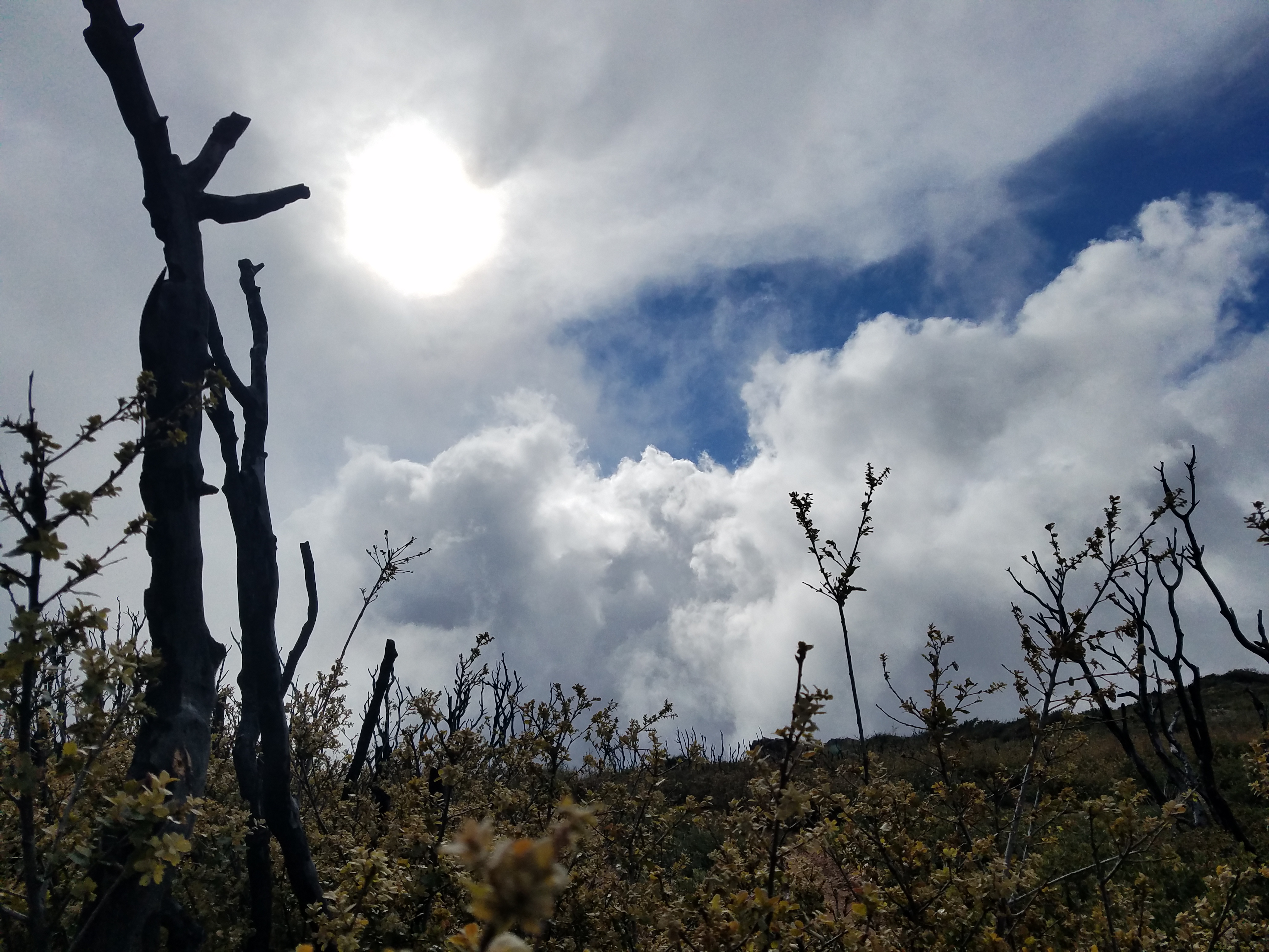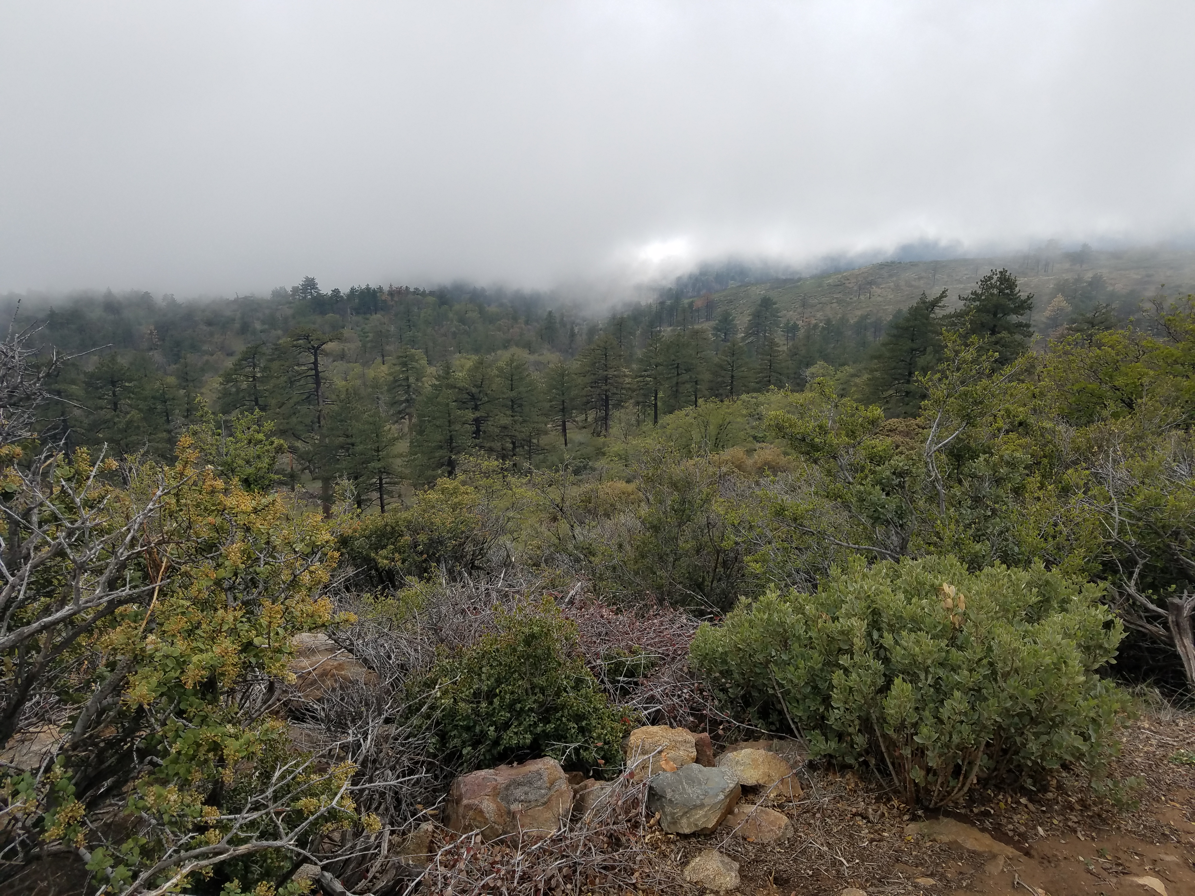 It’s wet but pretty, clouds moving every which way, dancing across the trail. It’s on and off as I move, enough to peek my head out, take some pictures.