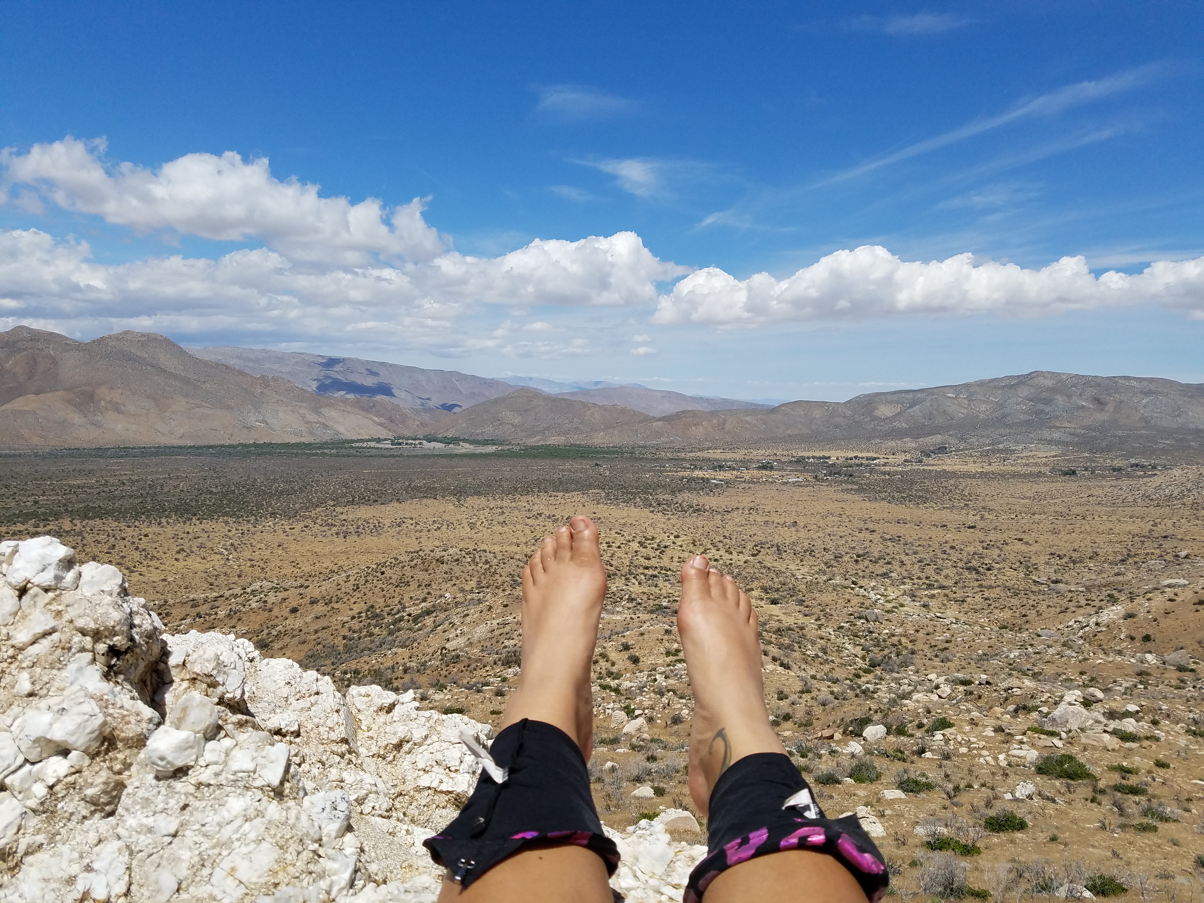 I stop to give my Mom a call, remind her I’m still alive and kicking. Dom catches me in the meantime, tells me Joe and Sarah had to hitch back to Laguna to trade in Joe’s boots for some trail runners, and then they’re hitching to Julian to stay for the evening. We leapfrog a bit back and forth before deciding to take a break on some slanty rocks. She immediately takes her shoes off, puts her legs up, kicks back on her pack to chill. Best idea. Crazy intuitive.