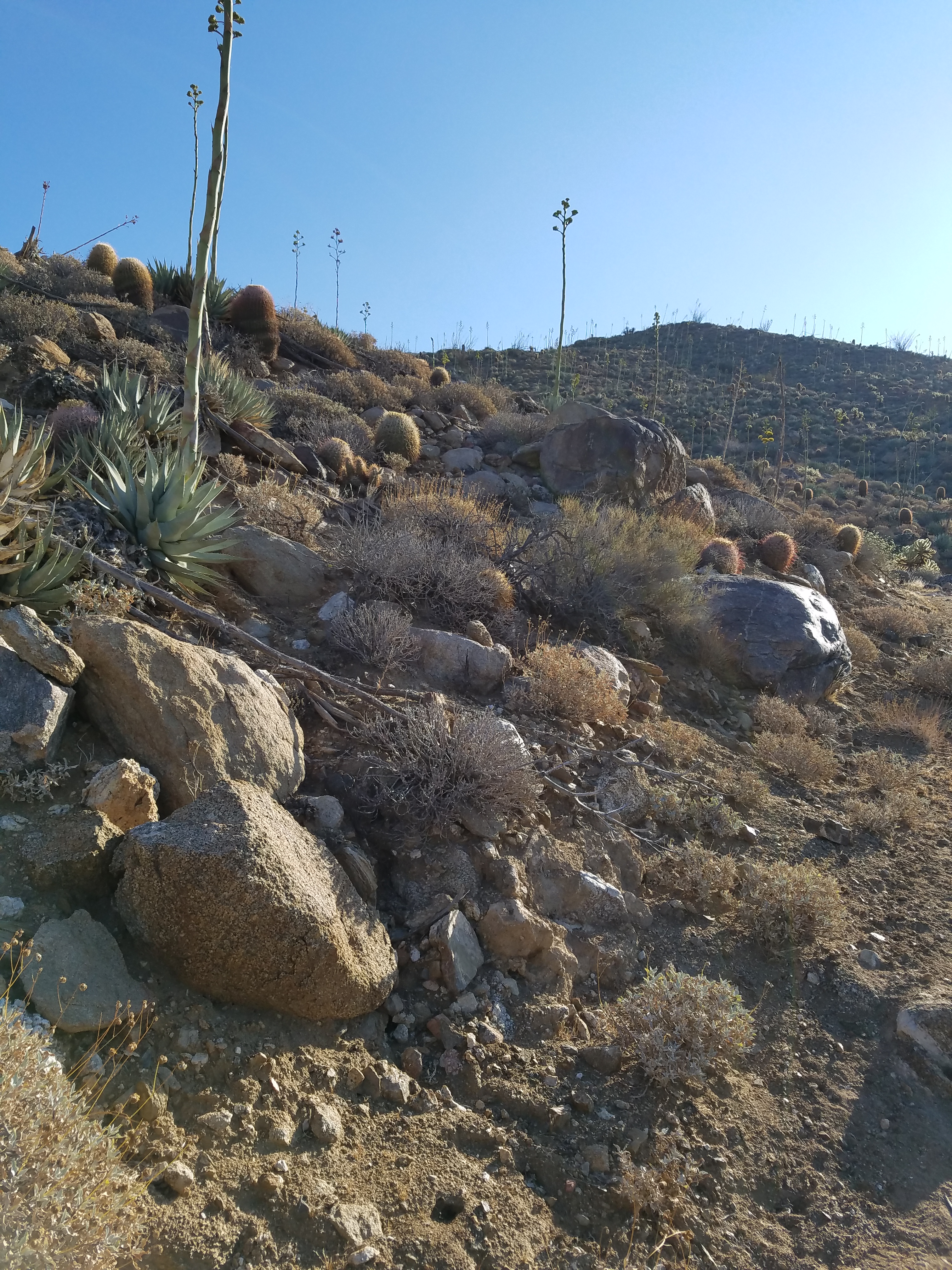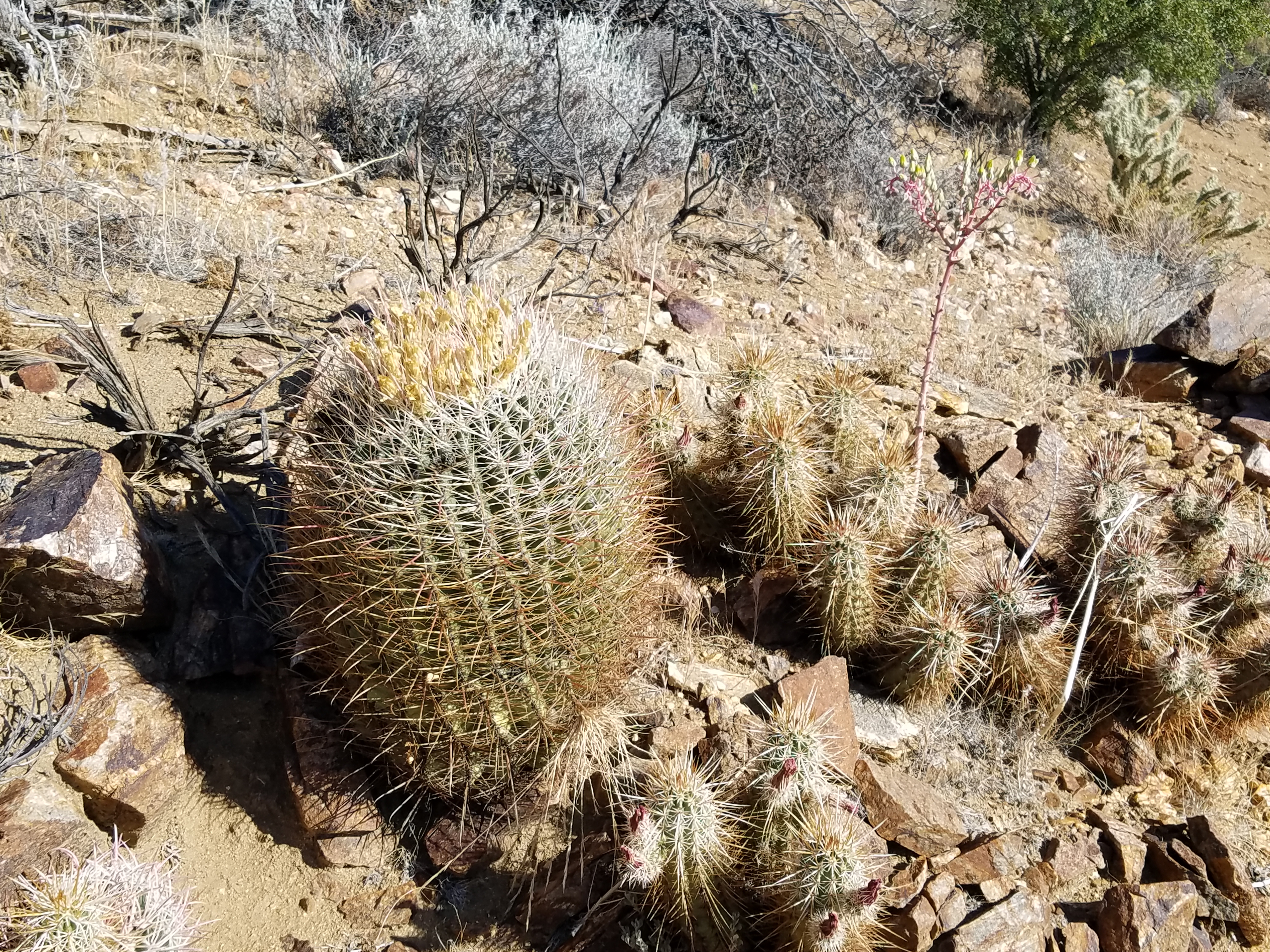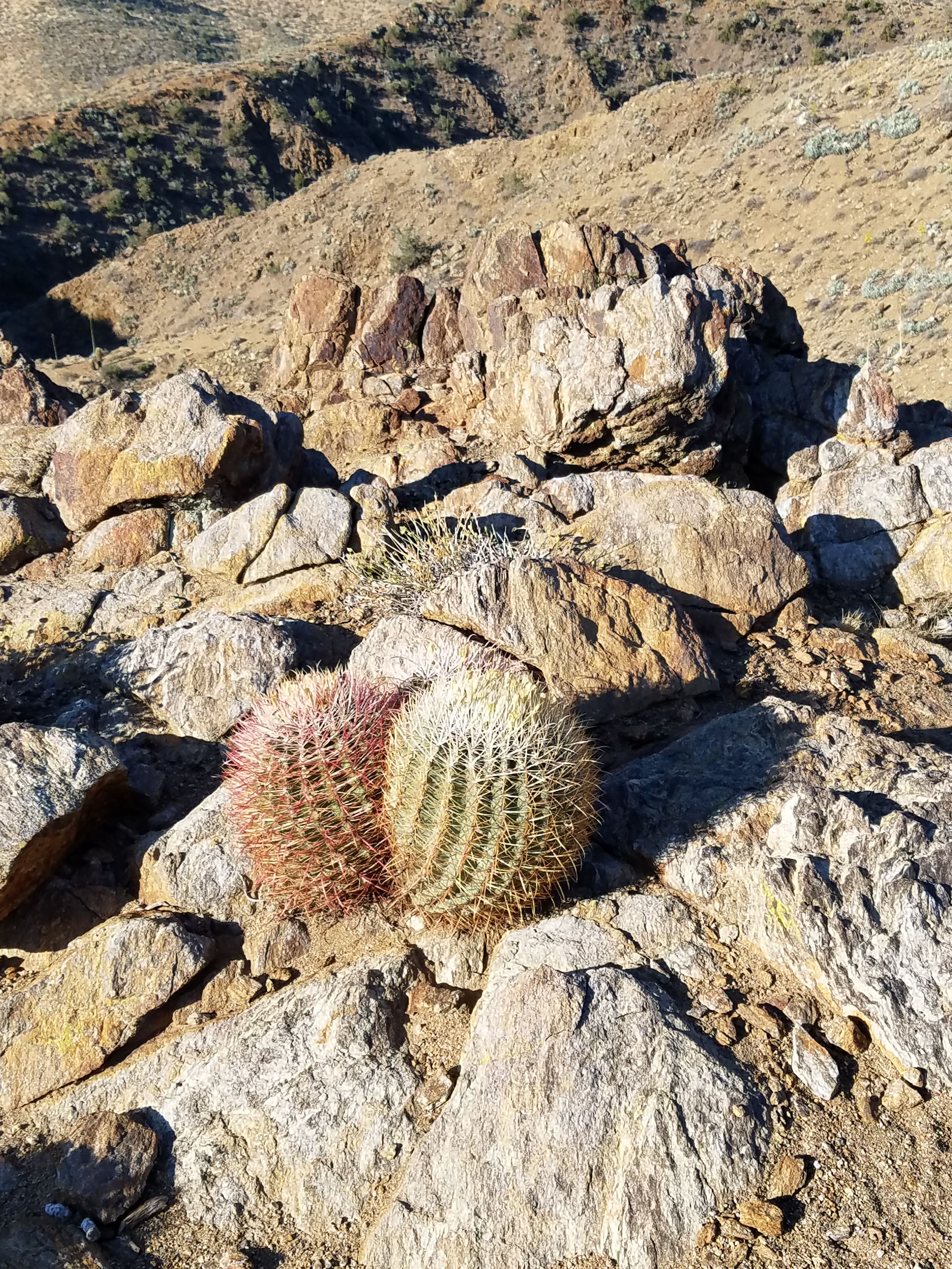 The very first thing I see on crossing the highway is barrel cactus. We haven’t seen barrel cactus before! Exciting. They look so dangerously huggable. This different kind of murderplant multiplies the higher I climb, until they’re all looming, staring down at me from the hills. I adapt the title of the movie The Hills Have Eyes into The Hills Have Cactus IV: The Barreling. I like my version better.
