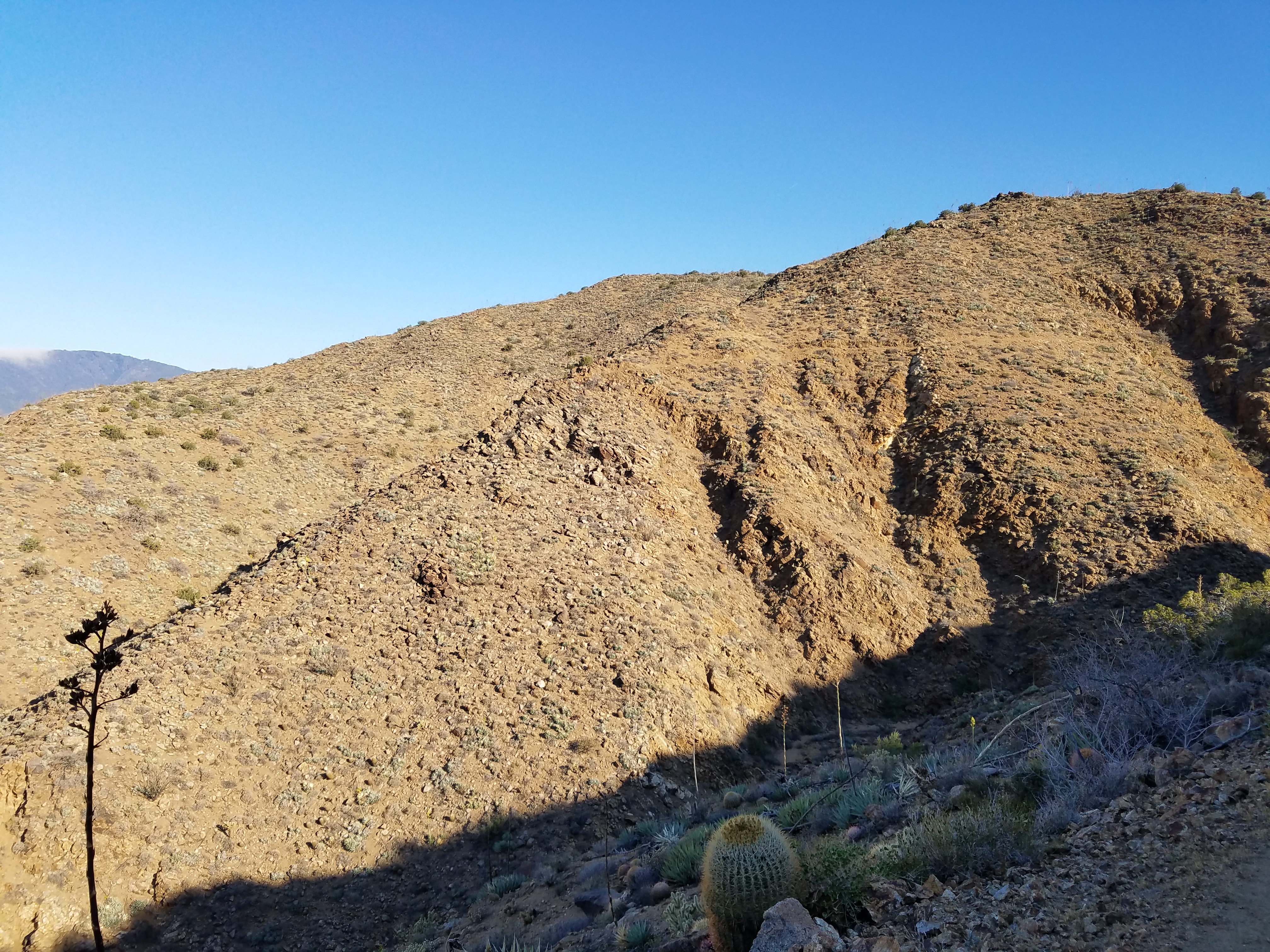 I can tell the Aleeve has worn off when my alarm goes off at 5:30 – my knees are achy again, but not so achy as to be unusable. It’s a bit of a struggle to pack up since I’m one of the first ones out, again, but that’s the only way I make miles. Today, especially – Yogi’s guide warns about the “long, hot, dry climb” out of Scissors into the San Felipe Hills, and I’m hoping to make the 14 miles to the Third Gate Cache before the sun gets too high in the sky. Time to officially implement plan “Sleep all night and also some during the day”. But first, I gotta get to my next sleeping place.