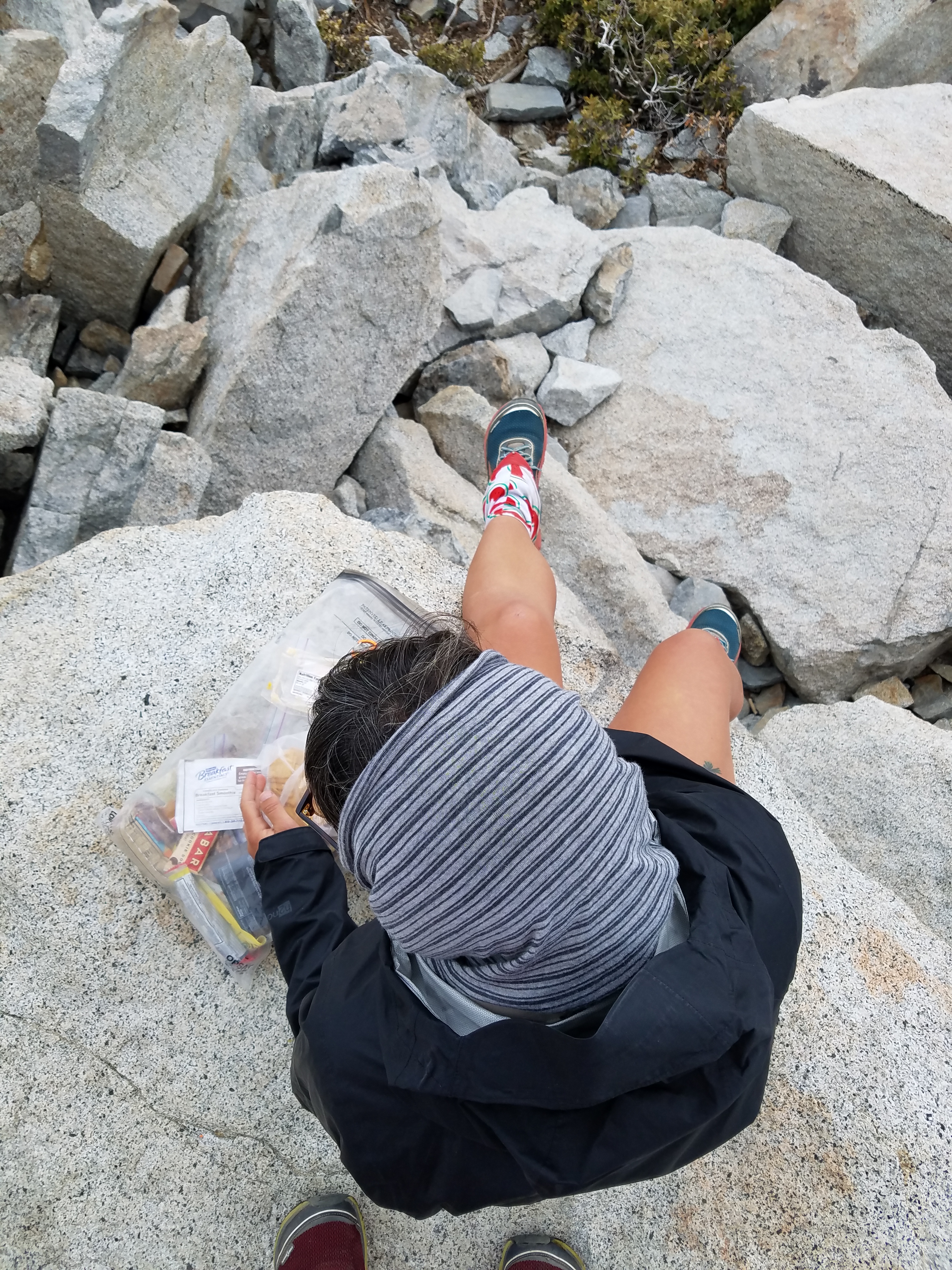 Sasha’s just started lunch, so while I’m a little nervous, what with the clouds and the weather that’s supposed to be rolling our way, I sit and eat, too. An older gentleman comes up to the summit another way, says it’s the easiest – I knew it.