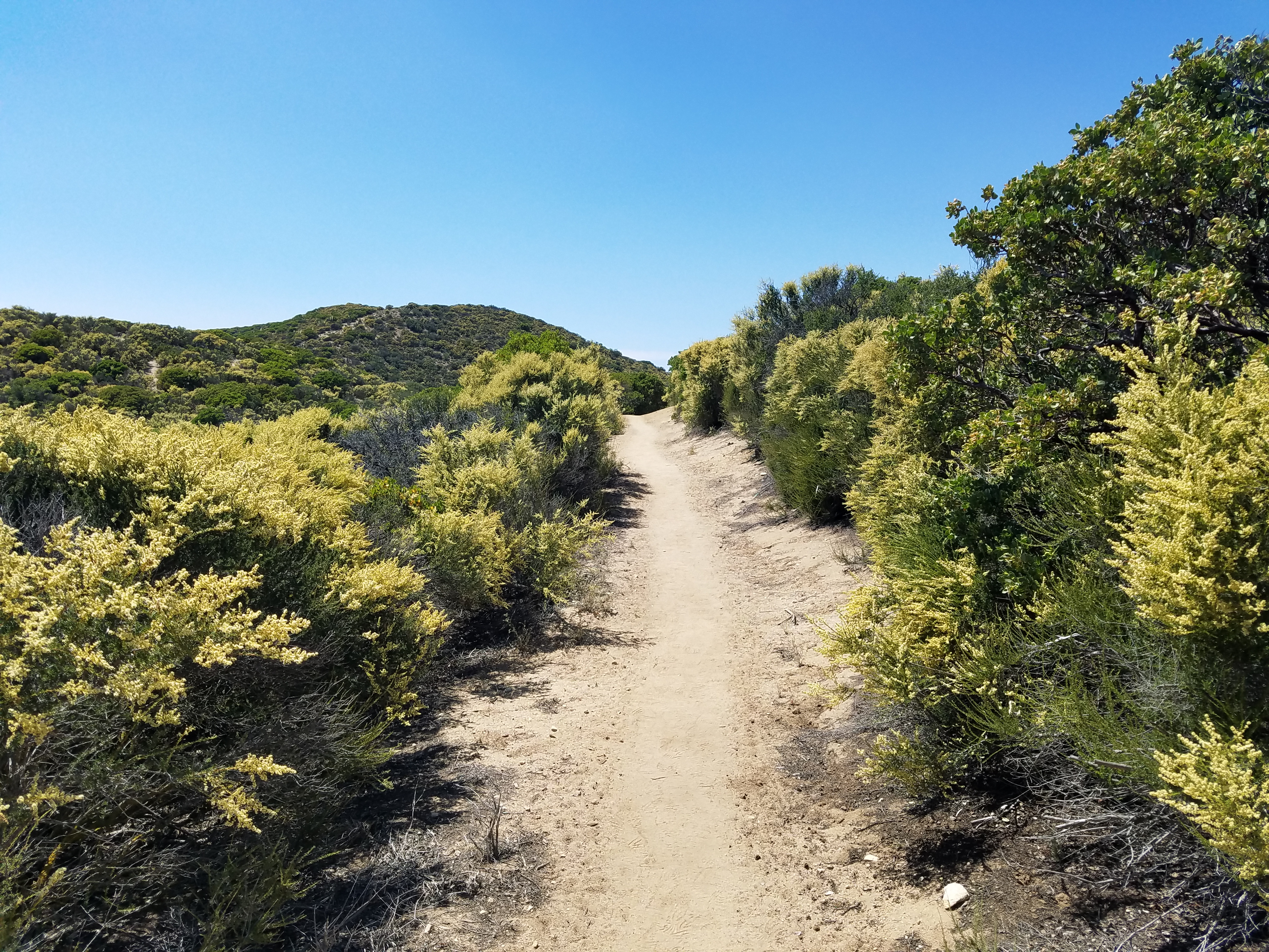 A woman walks up, joins me in a different shady spot; Stork drinks some of her water and laments setting her pack down on her hydration bladder’s bite valve. She’s got half a liter left for the next ten miles. I agree to give her a half liter at least, but advise her to stay until the heat of the day’s over. We sit and chat until the sun’s overhead and there’s no hiding any longer in our current spots; I nestle under a plant that sheds nearly all its pollen on me, until I’m covered. Ugh. At least it’s shady.