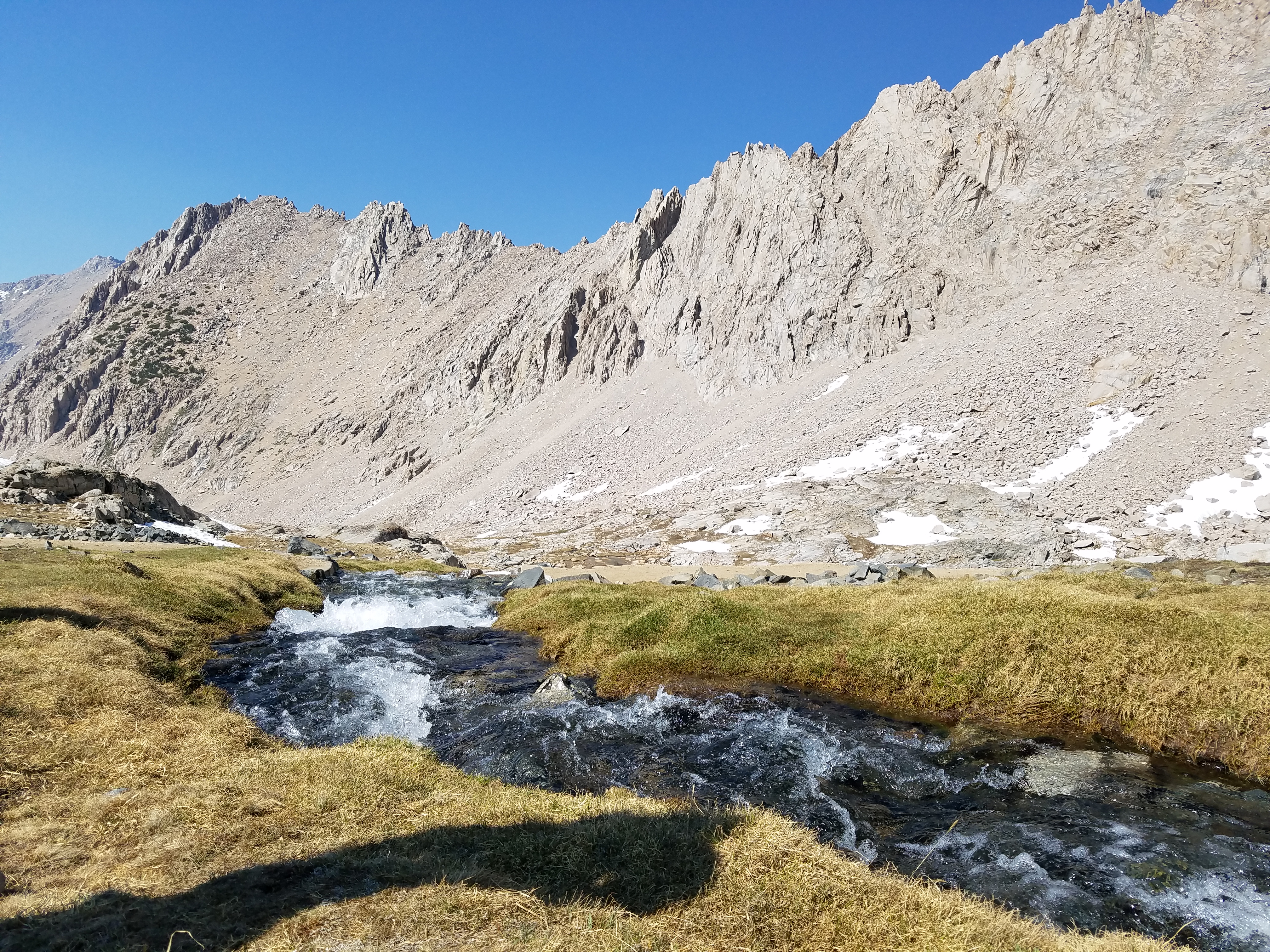 I run into Outro near Tyndall Creek; we find our way across, eat while we wait for the others, wash socks in the stream. Yoda, Homegrown, and Sprinkles are all together, and reunited we make our way further up towards Forester Pass.