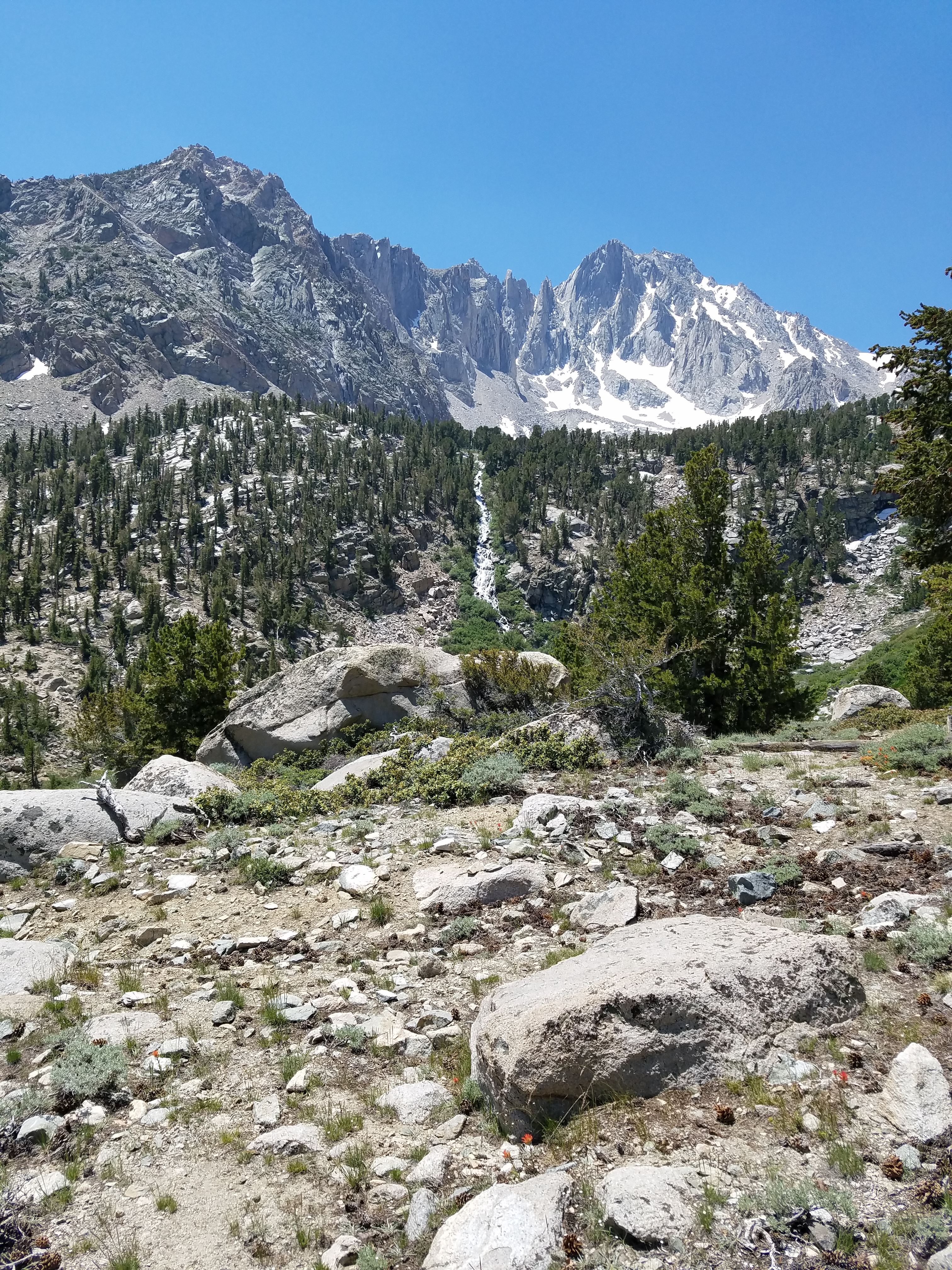 The Kearsarge Pass trail proper isn’t too far off, but once we arrive it seems to take forever, even though there are beautiful views to distract us.