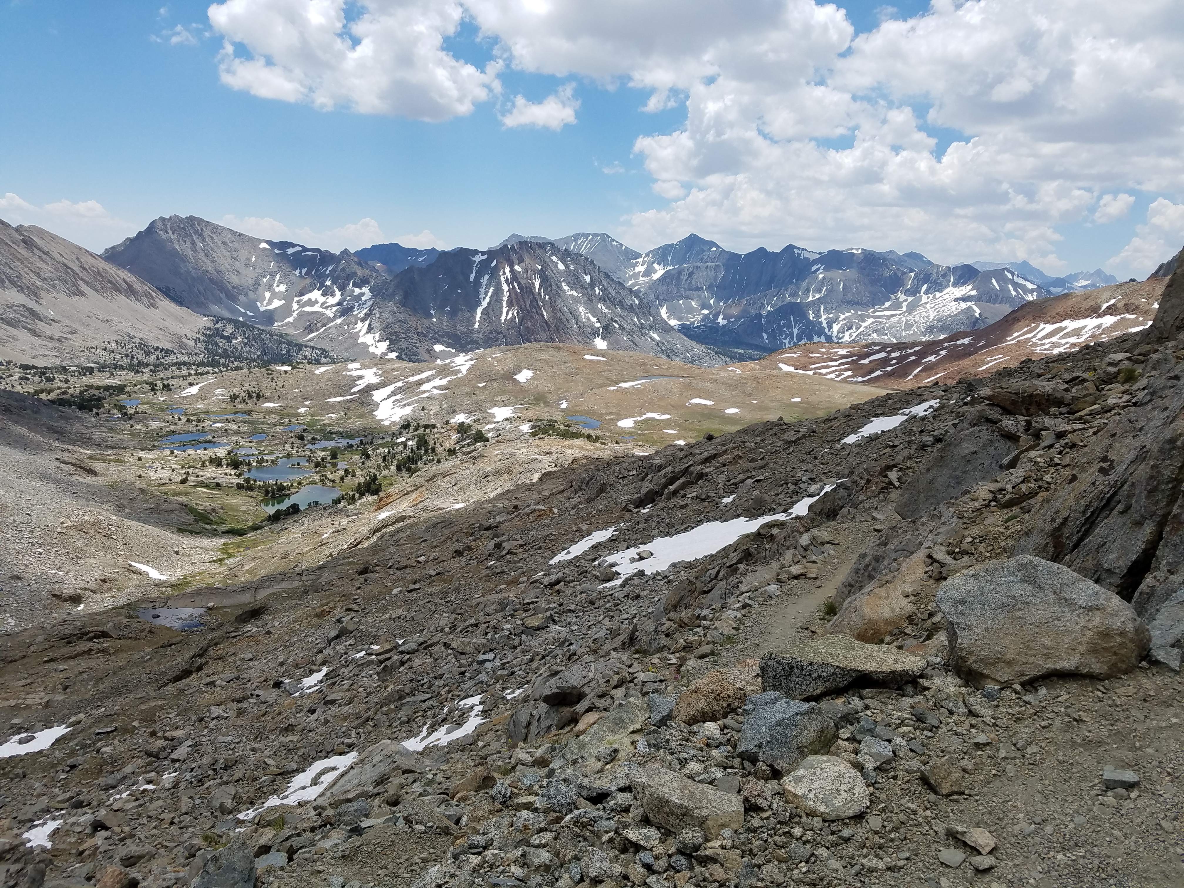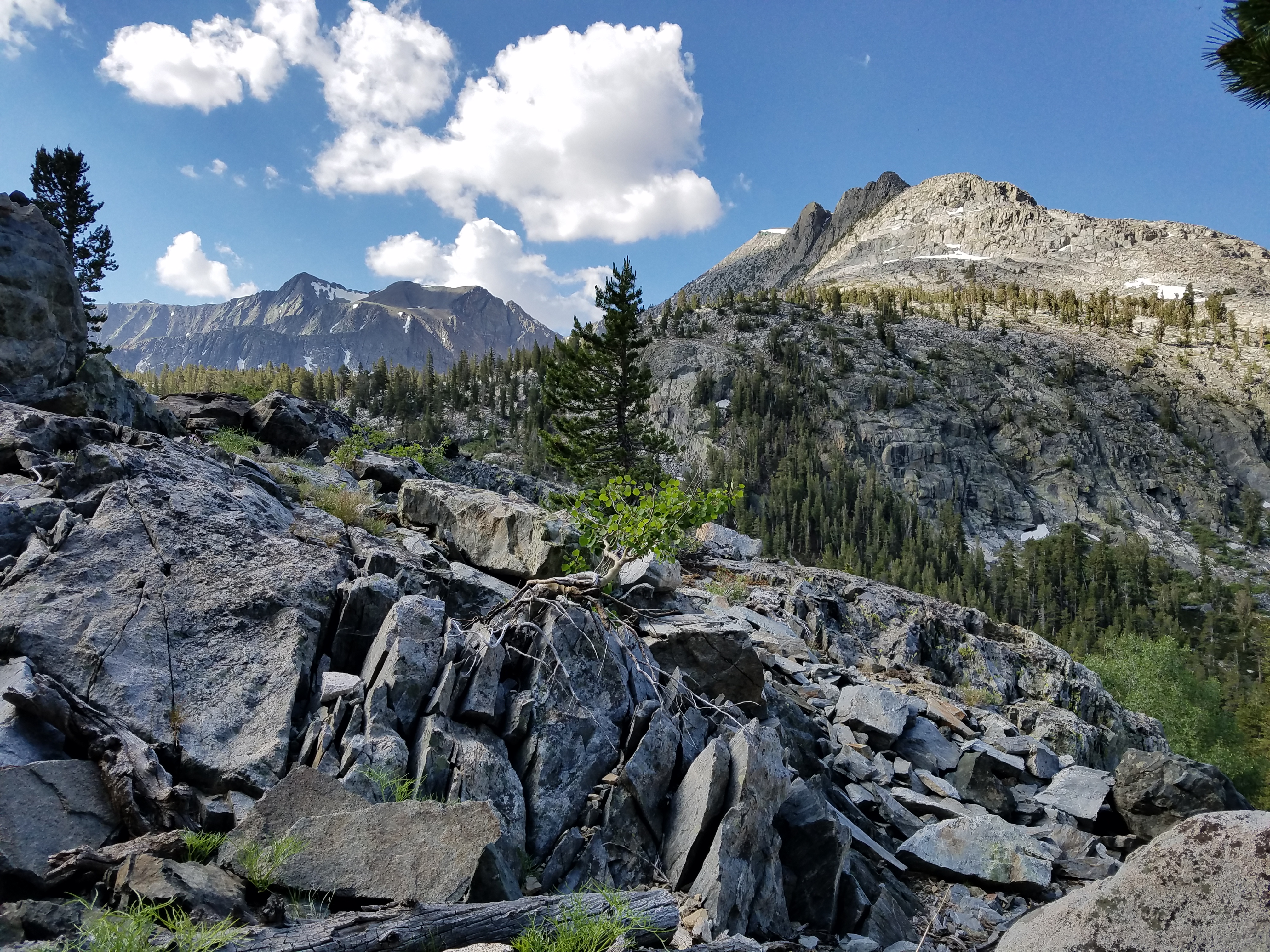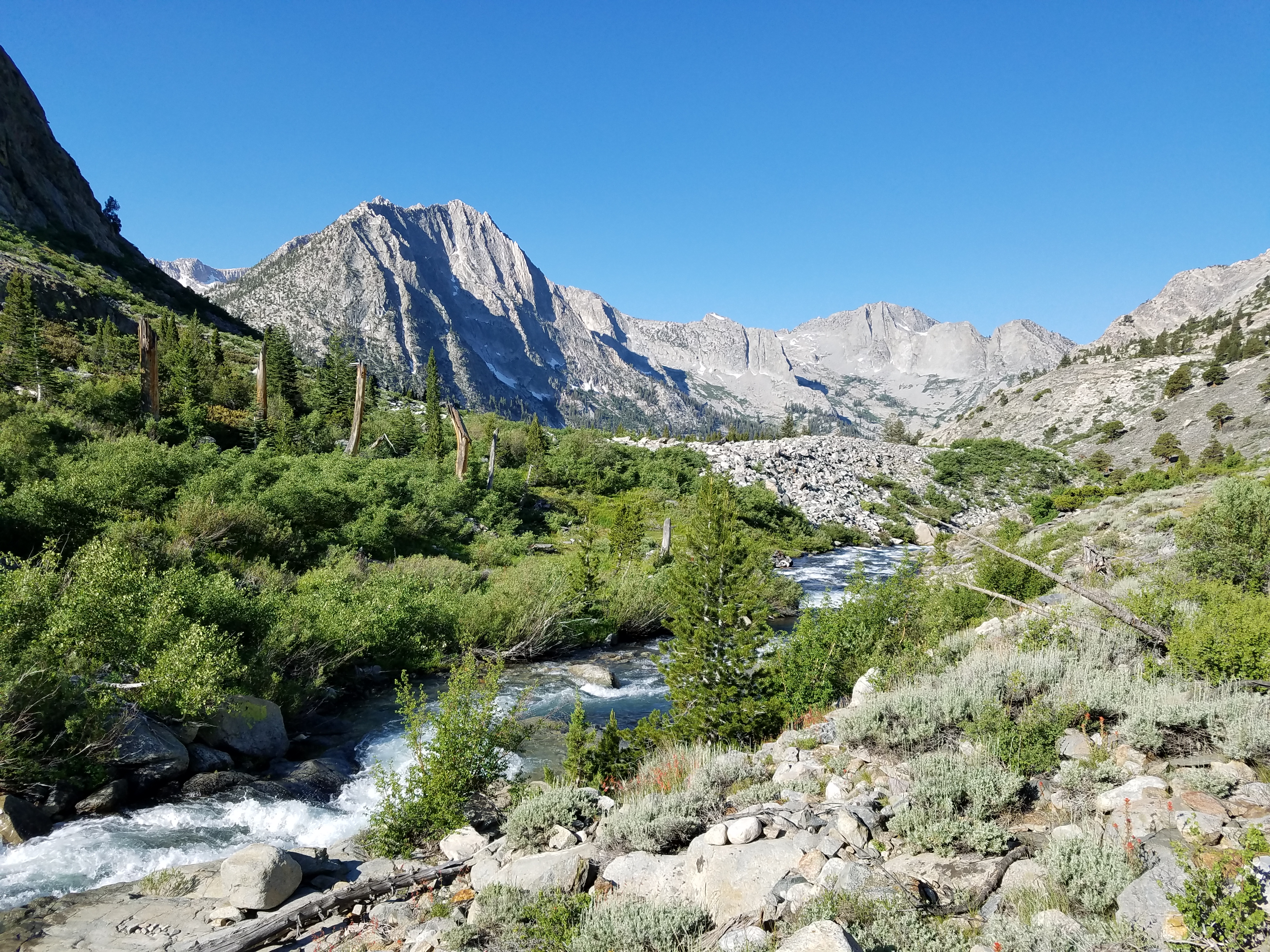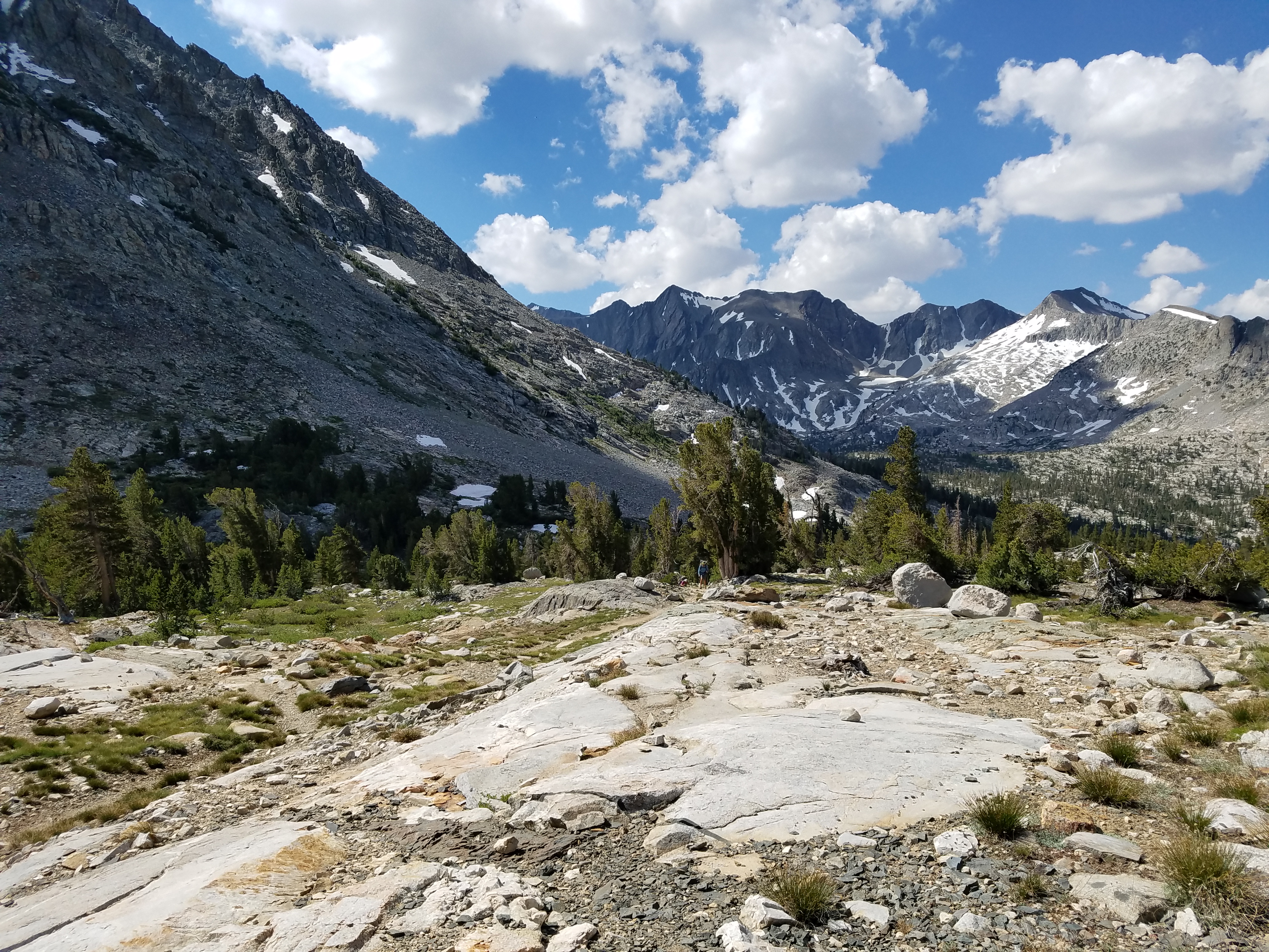 A lot of stream to be crossed this morning, some of which I am successful at staying dry over, some of which I am not. A lot of down, too, for this section in which we are supposedly climbing to Pinchot Pass. Ugh. At least it’s gorgeous.