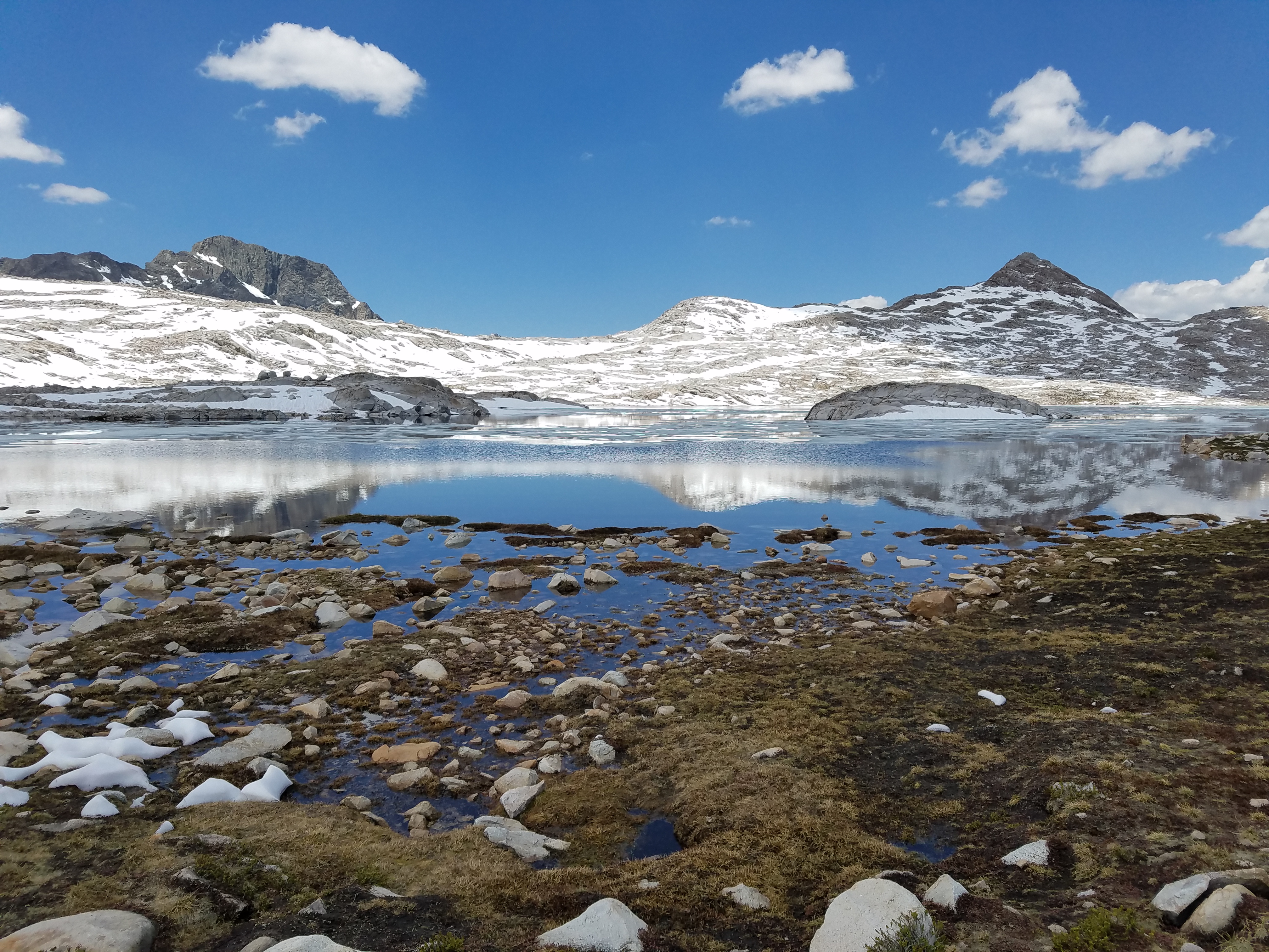 I don’t stay long before I’m antsy, need to walk away from the building clouds – but going down is going into a slippery minefield of slick, melting, posthole-y snow and boulderfields to clamber over in between. There’s no place to glissade at all, and I find myself on my ass twice – the whole thing’s physically and mentally exhausting. And once we’re out of that and beside a lake, the trail is pretty much a feeder stream the whole way. My feet are wet, but at least it’s pretty.