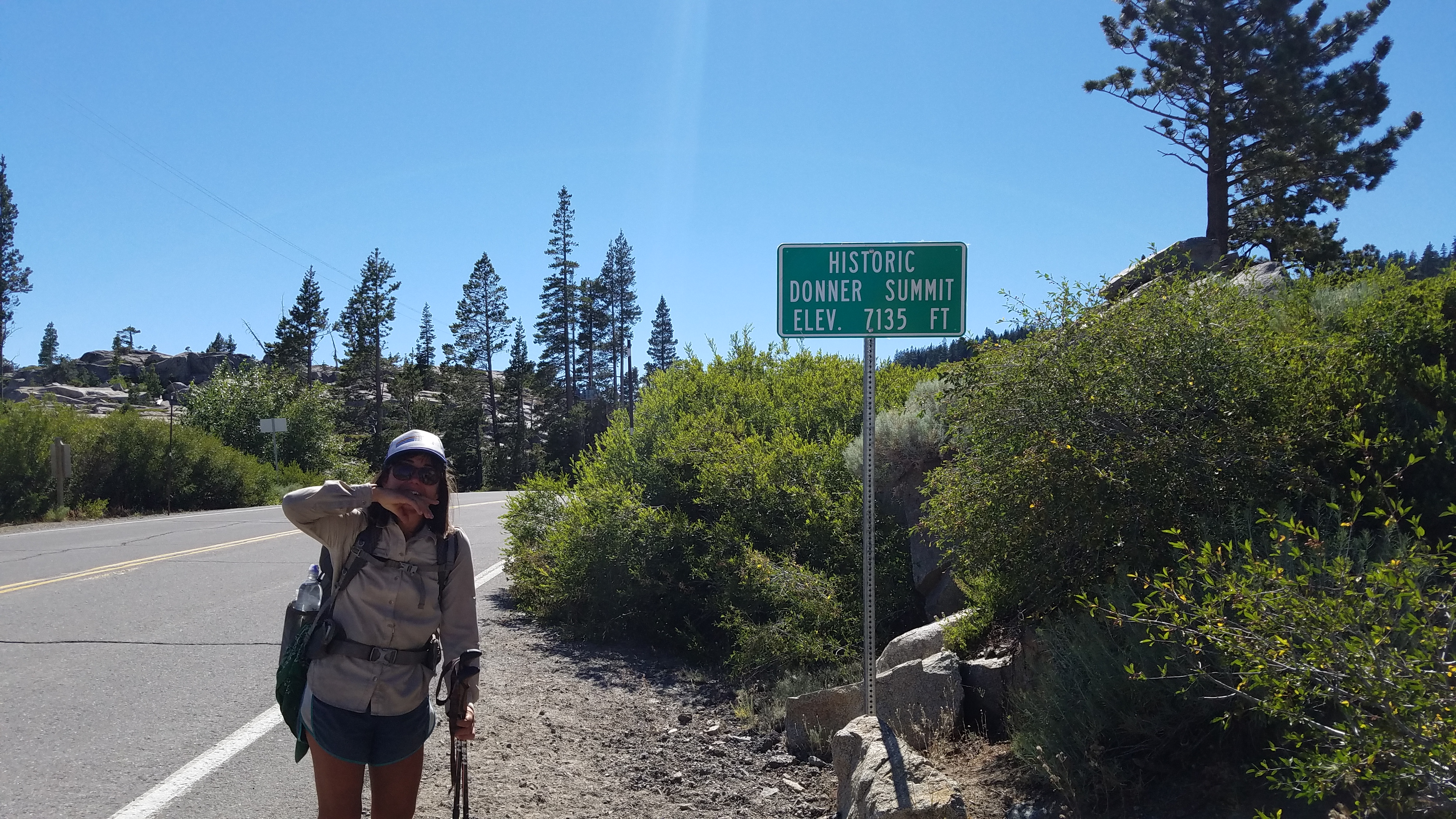 We make it down to Donner Pass trailhead, where there’s a portapotty and I don’t have to dig a cathole. Then, the highway, where we scooch the quarter of a mile west to the Ski Ranch.