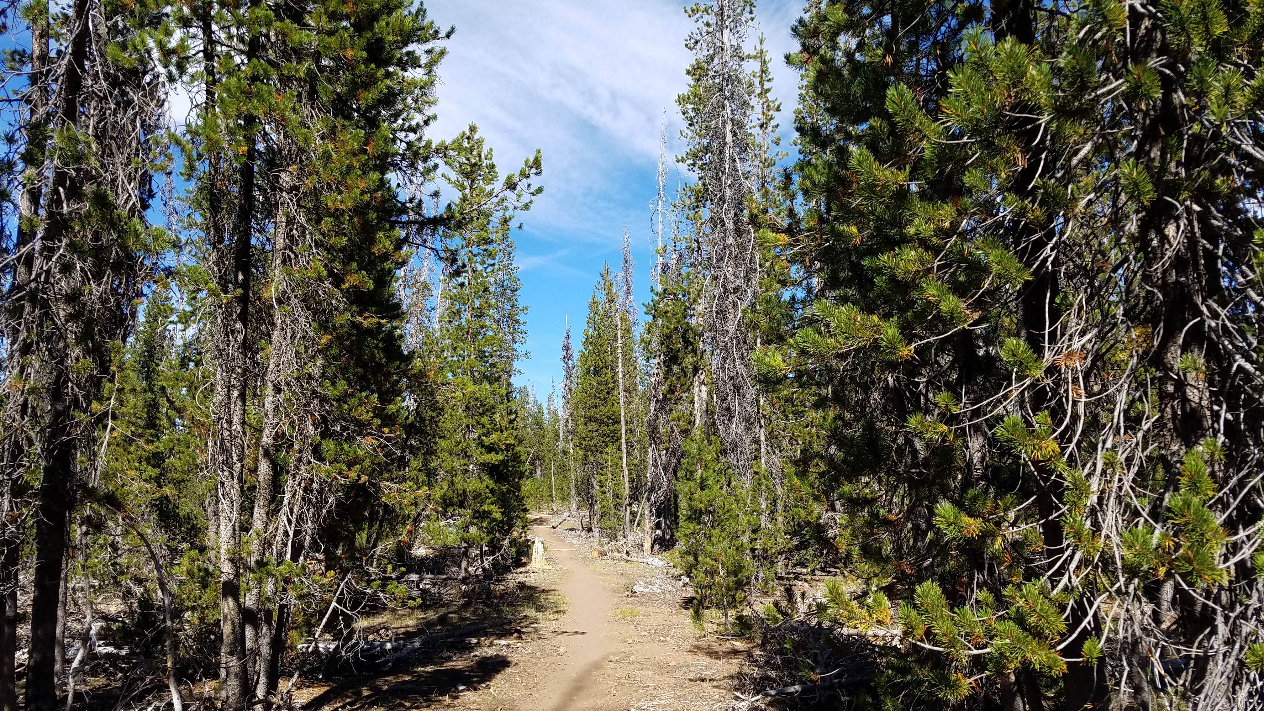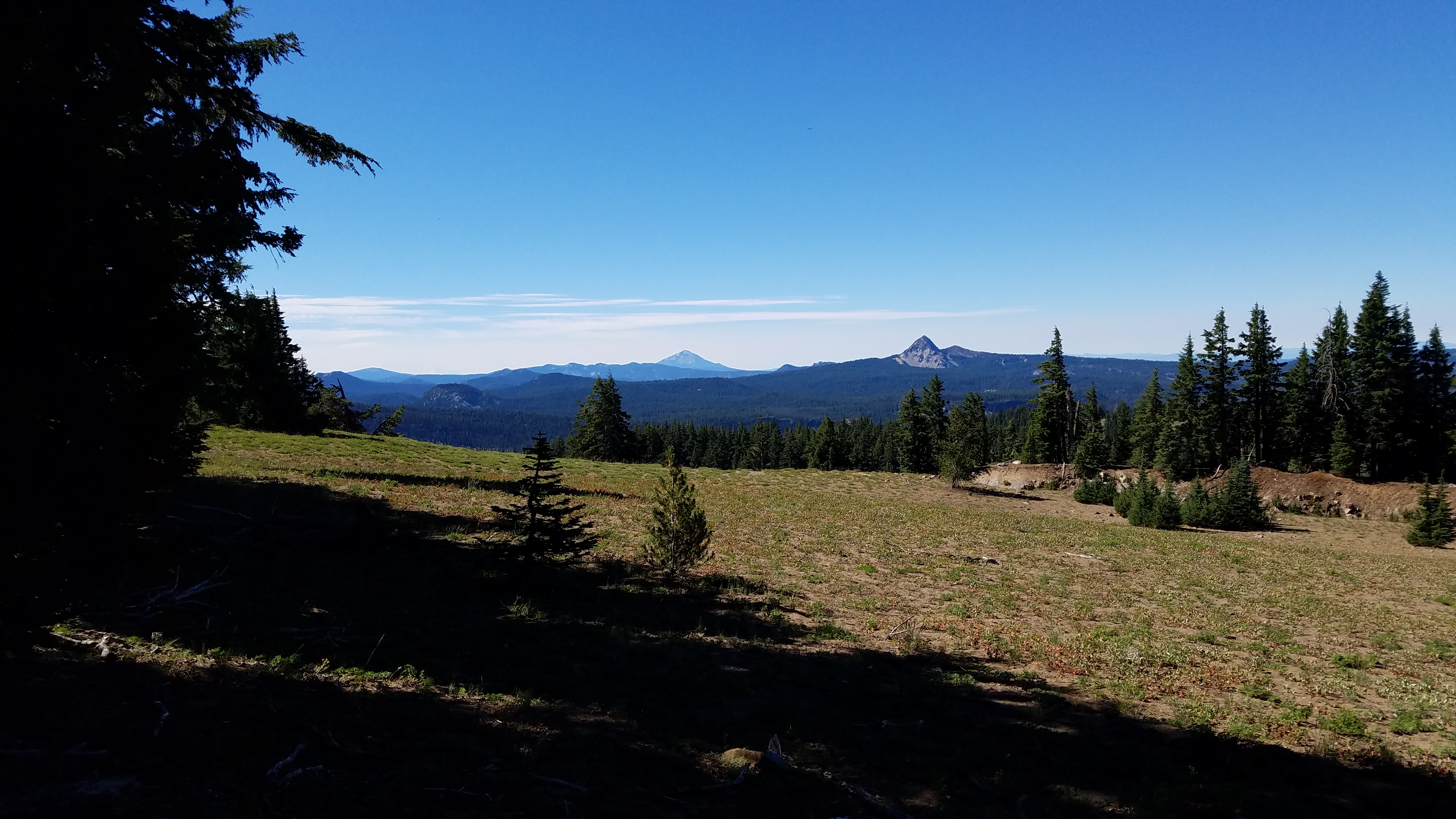 It’s not long before we hit a dirt road, meet some folks who’re gonna summit Mt. Thielsen in the morning, who are interested in some company; Spesh, just coming from boatloads of people, wants some woods time, so we move on along further up the hill. Looking at the profile, it looks like things open up right around 1848.5, so we head on up and start scoping out spots. It’s only another three-tenths before I spot a nice one, way off trail, flat and beautiful and clearly already impacted. Home sweet home.