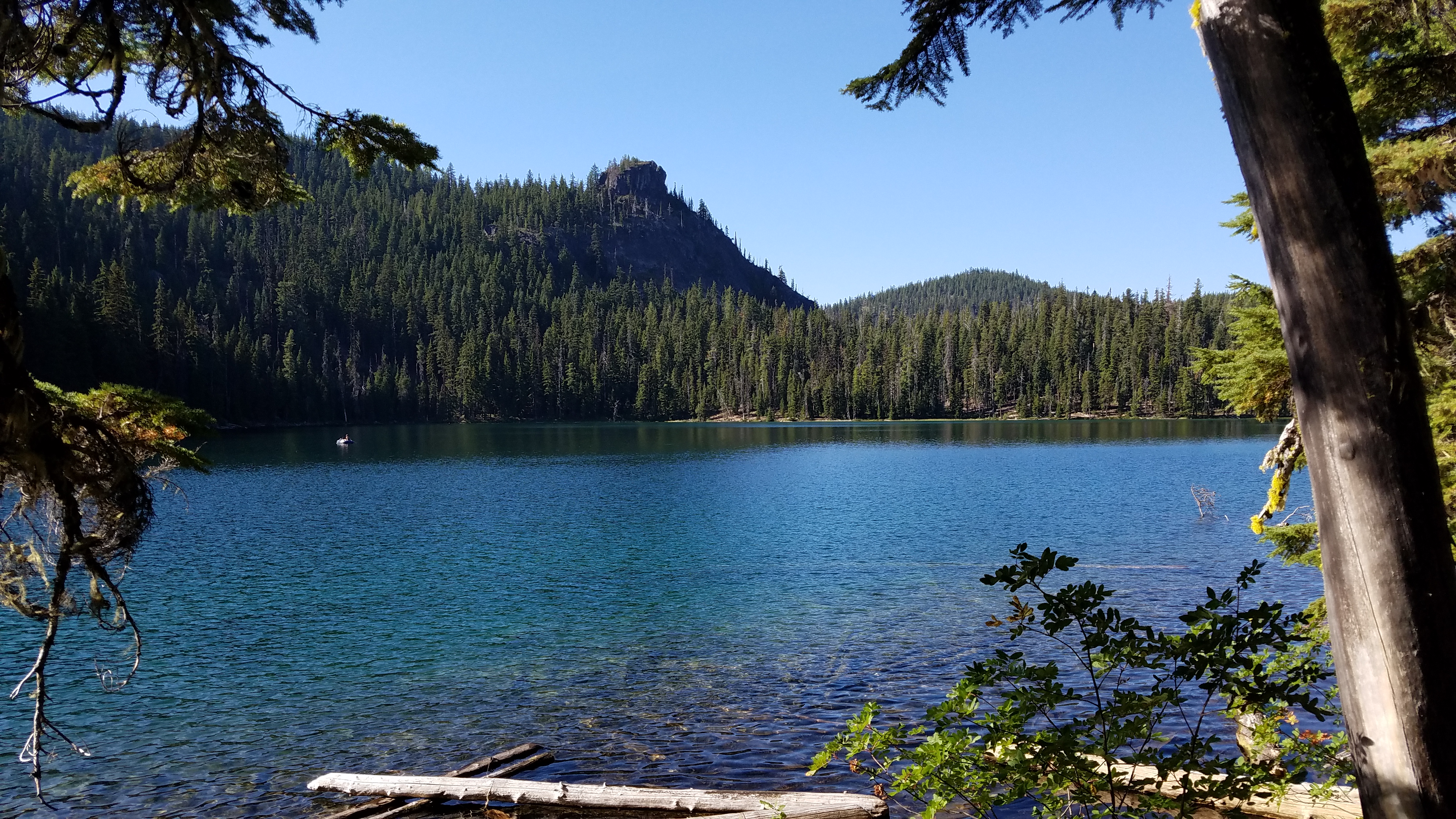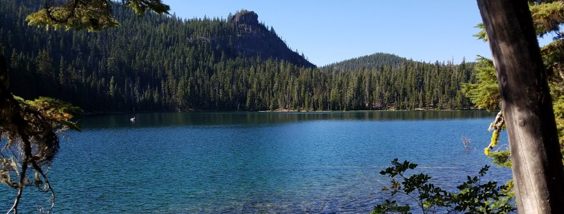 Five miles is nothing these days, and we pull into Willamette Pass just before 10, find a safe place to hitch from with a convenient pull-out so the cars flying by have a place to stop. We wait for about 20 minutes, before I hear someone hollering about hikertrash from behind me. It’s Butterscotch! And his dad and his pup – they’ve come down to meet him, to bond. The trio has met up a couple of times on trail, and Butterscotch likes to do trail magic since his dad has a car, so it’s off we go, down the hill to Crescent Lake.