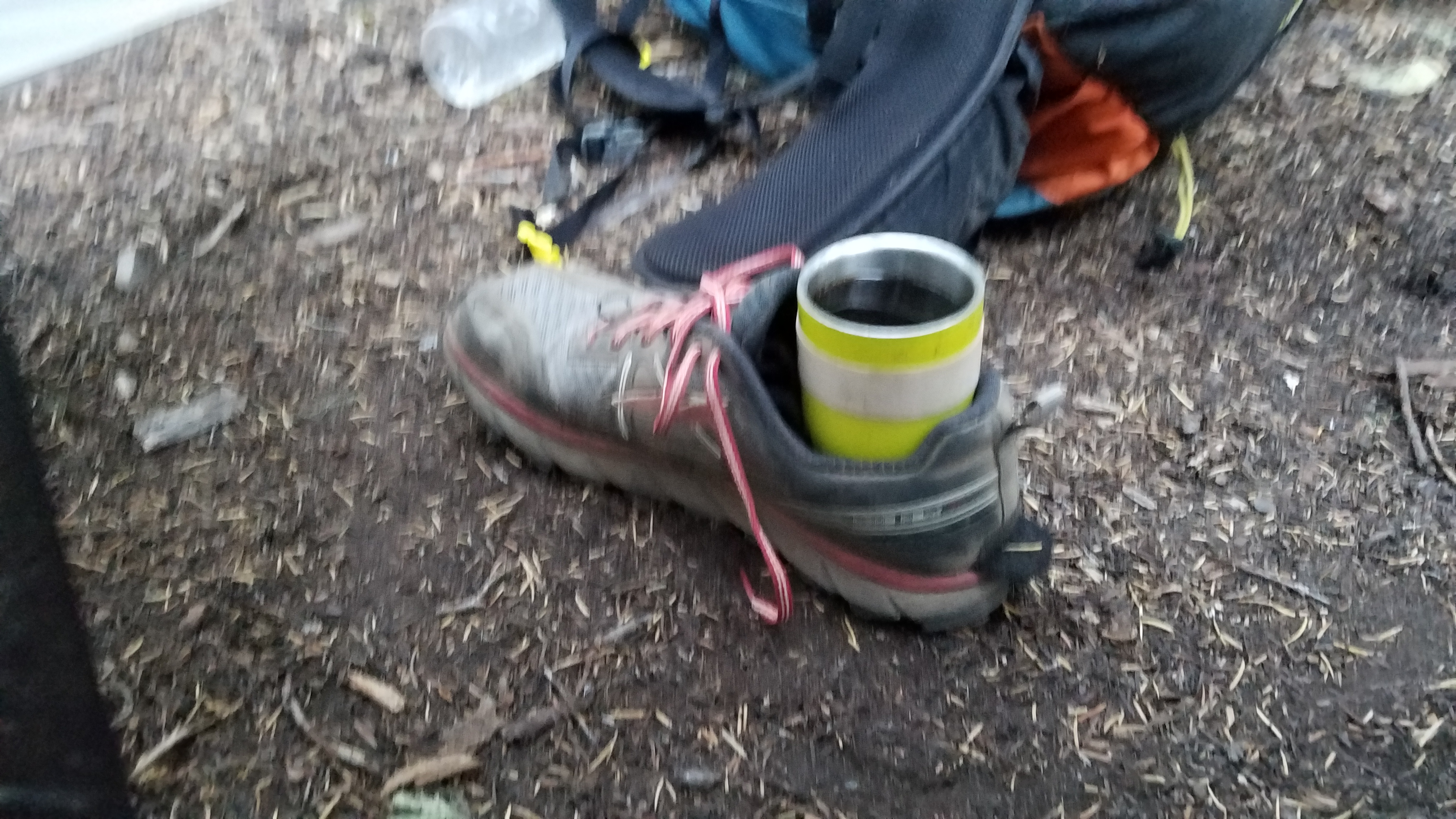 We opt to push at the last moment for Dumbell Lake, where there’s a nice tentspot overlooking the lake. There’s a family with a small dog out for a… day hike? Weekend? It’s hard to tell from their packs, but I’m pretty sure you’re not supposed to have dogs in Wilderness areas1. I eat and try not to judge, though I get distracted by talk of my hip, of where we’re going to part ways. Spesh doesn’t really have any desire to hike north of Mackenzie Pass – there’s apparently a lot of lava rock in that area, and it’ll be harder to catch a ride to Bend – where he’s flying out of – from Santiam. Plus, he wants to have a zero with me in Bend, if I’m willing. I say I’ll think about it. Probably for the best, given my hip and all, but we’ll see how I feel.