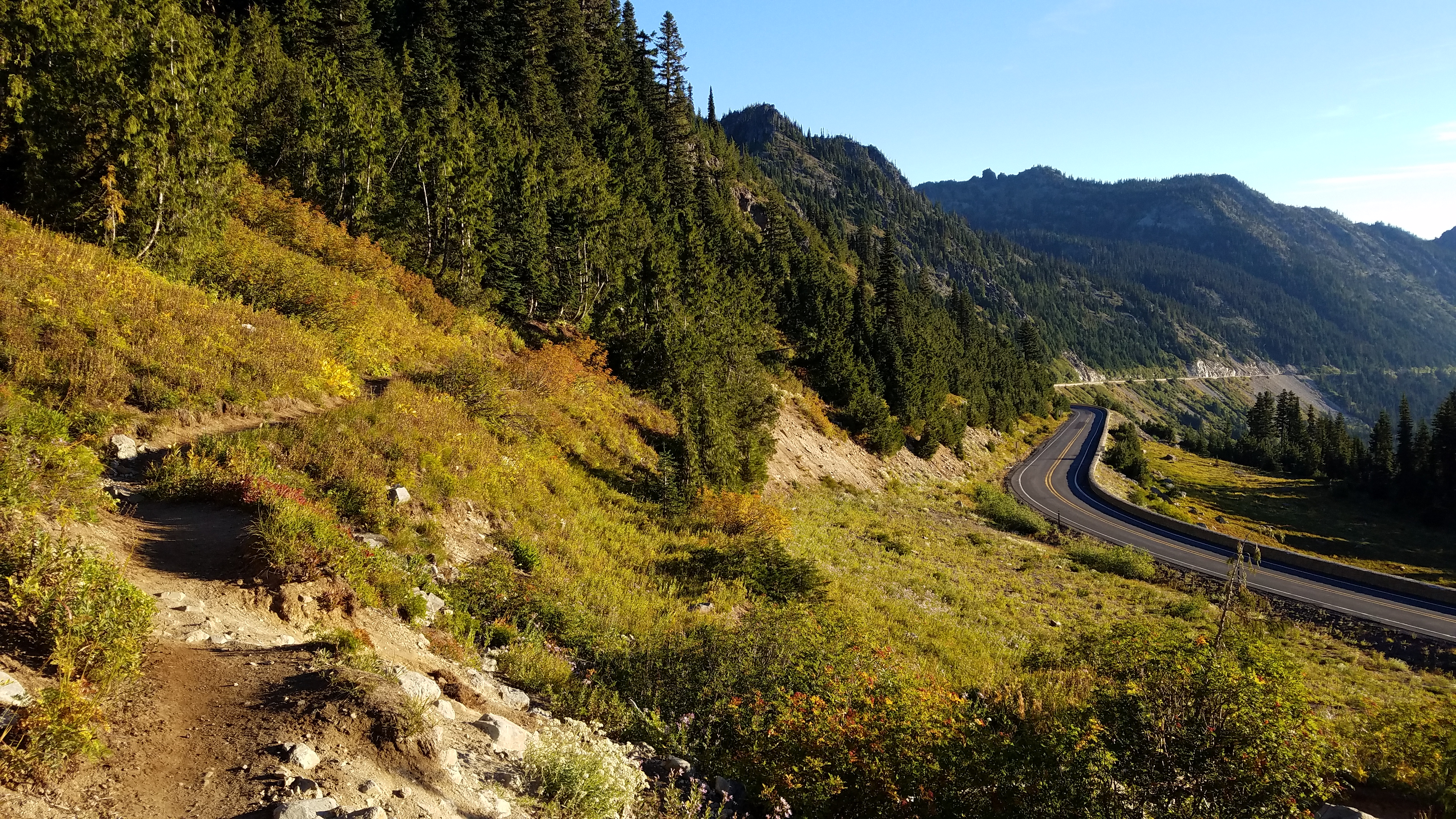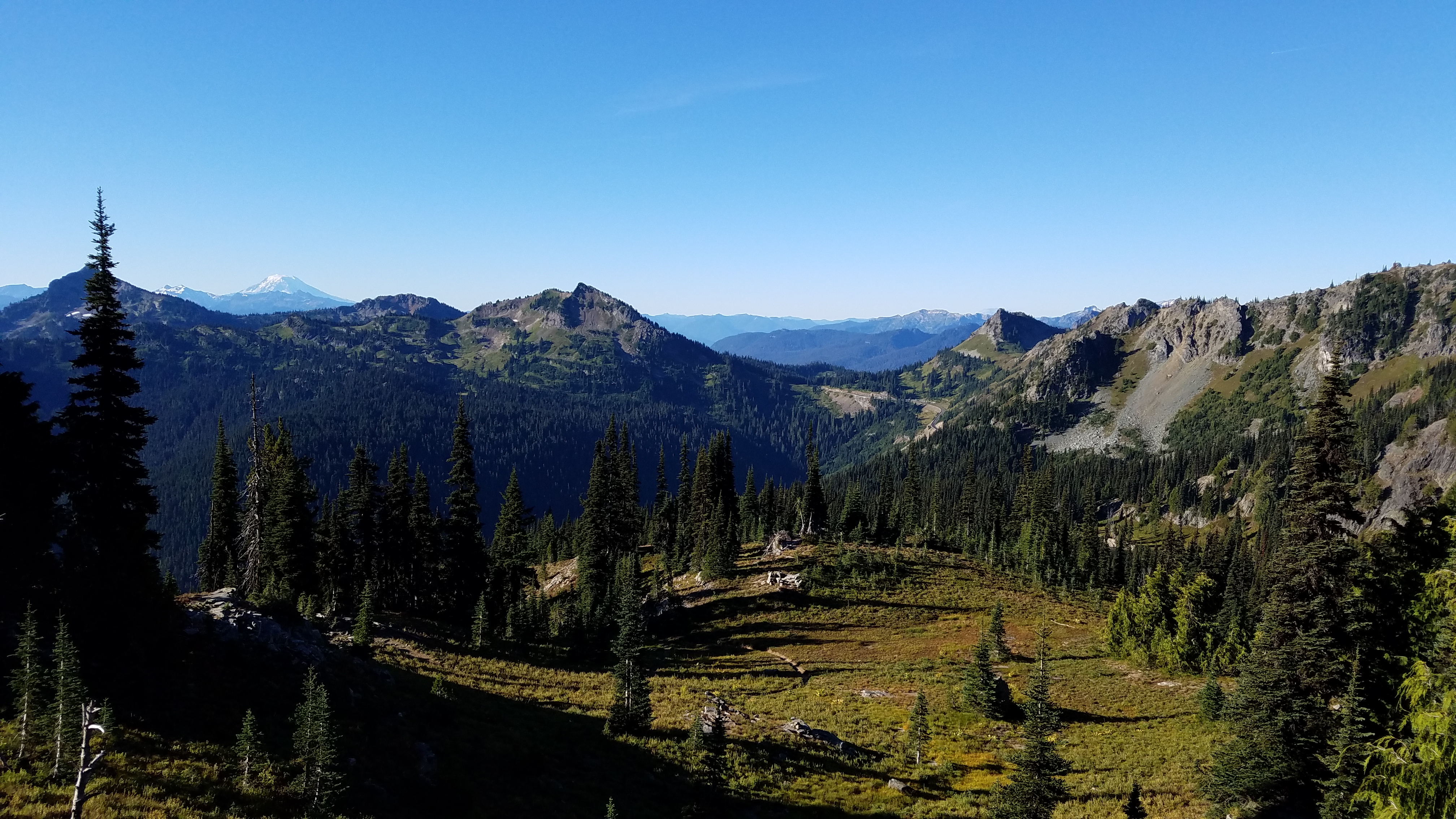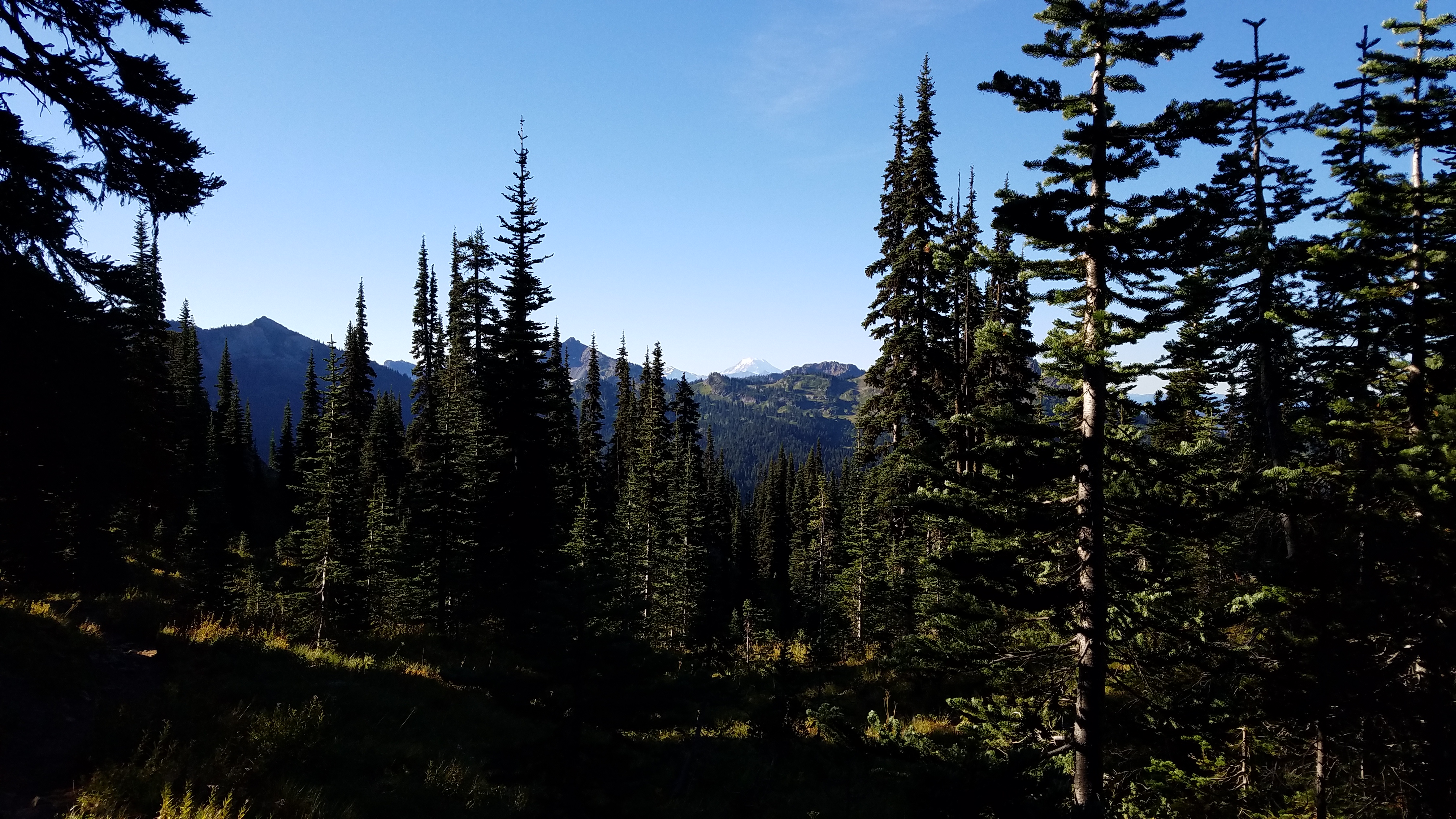 The night is quiet, so quiet – this has to be the quietest place I’ve ever been. The deer I spooked earlier going to pee seemed strangely loud, but things have settled in for the evening – myself included – and it’s so quiet that my eyelashes scraping against my sleeping bag are nails on a chalkboard, and my heart is thunder raging in my chest. There’s so little sound that I have no reference for what’s loud or quiet, and, so disoriented, it’s less sleeping than it is my brain deciding that the input not matching expectations requires a hard reset. In the morning, I’m well and truly ready to leave the silence of the evening behind, and my footsteps are loud as I make my way down the hill to Chinook Pass.