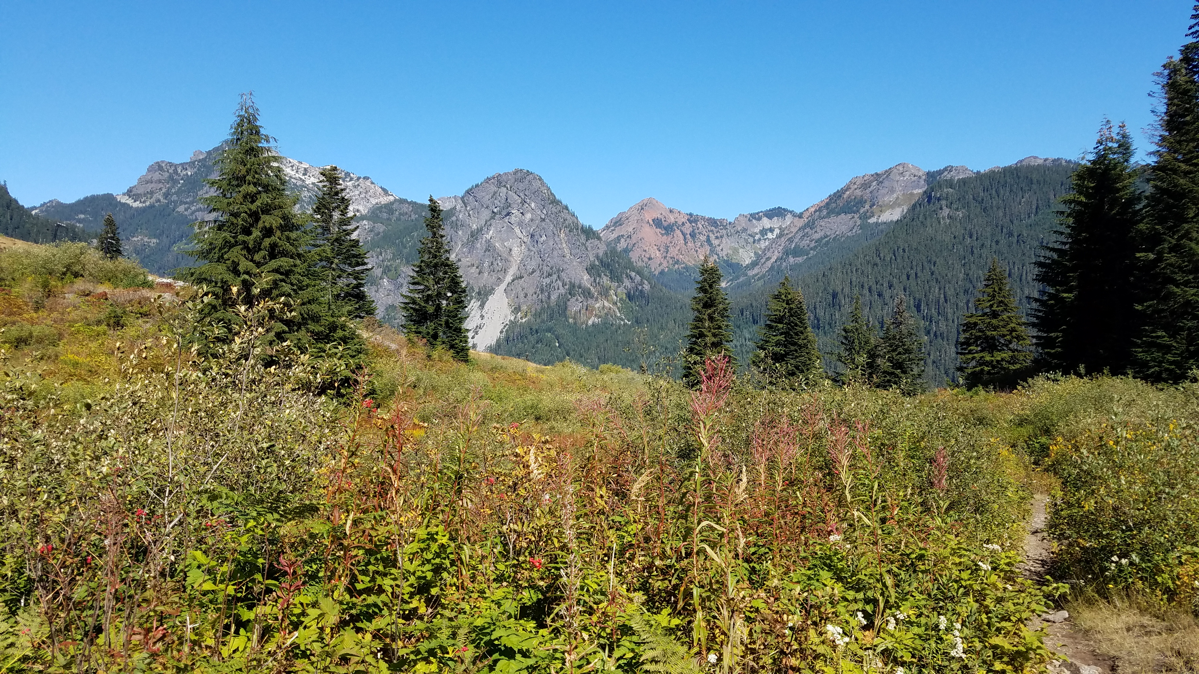 I’m not five minutes out of camp when Boy Pockets and Tenure catch up to me, pass me. I’m able to keep up, although I’m pushing it, I know. It helps that we’re on a downhill. I turn around, and Cookie Scrambler’s right behind me; so nice to be in the company of people again! We leapfrog all the way down to Yakima Pass.