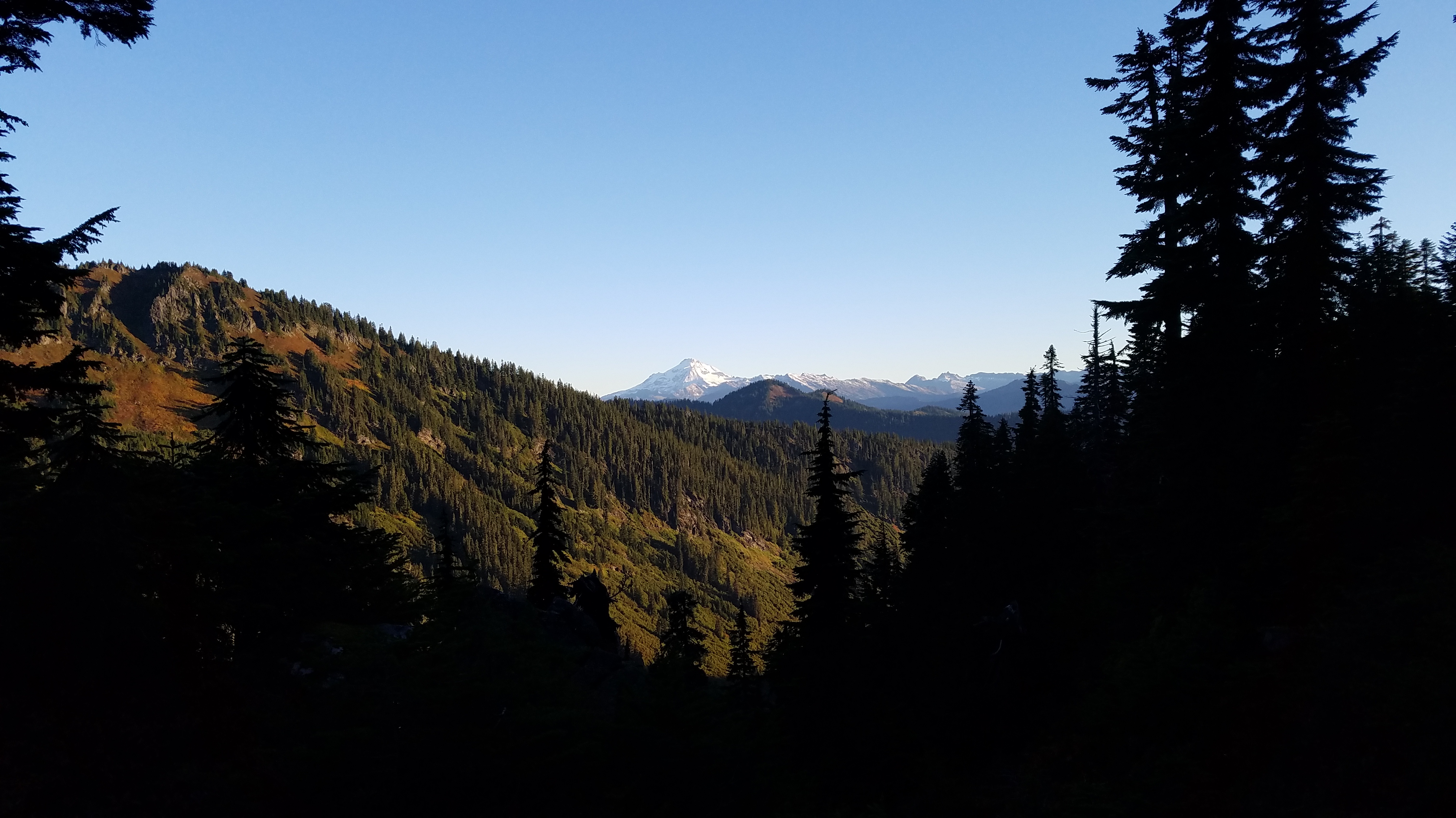 Grizzly Peak is wooded – I could’ve slept here last night, and, as it turns out, with people, womp womp – and provides great views of what I presume is Glacier Peak, whose wilderness I’ll be entering soon. Lotta snow up there, regardless.