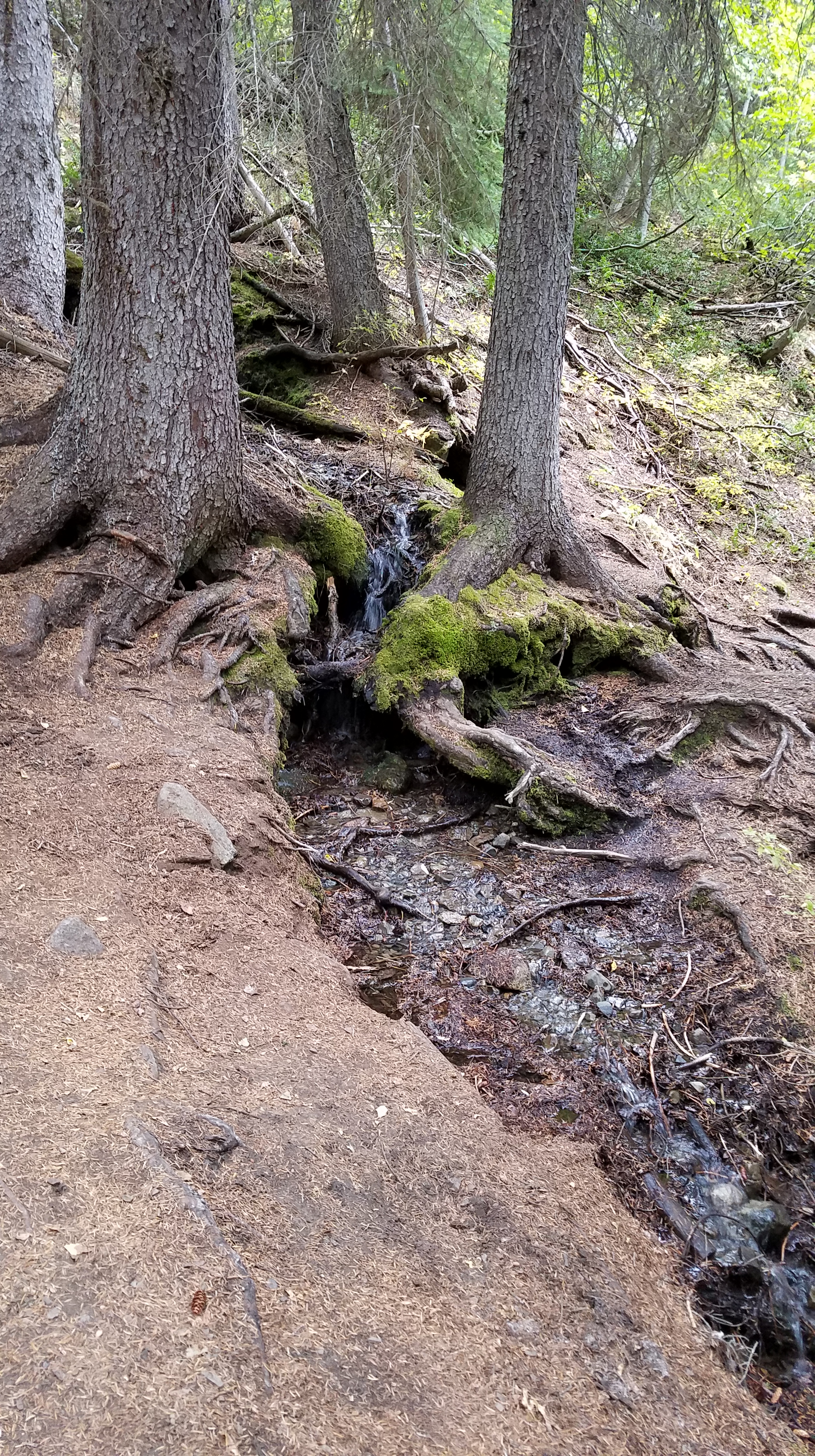 The trail meanders into the woods a bit, into a campsite where the bear box – Canada has shiny things like bear boxes in its campsites – is full of hiker leavings. I don’t need it, so I ignore it, cross the creek and then start the last-last climb to Manning Park and victory.