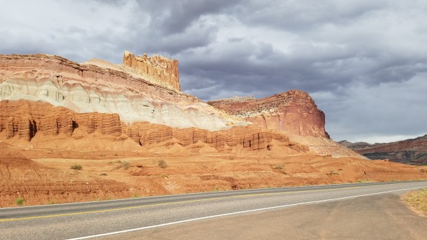 The weather means it’s not particularly prudent to drive the dirt road up the length of Capitol Reef National Park as we’d wished, but we do get to drive across it, and with the way it feels like home, I’m surprised that it’s so empty: