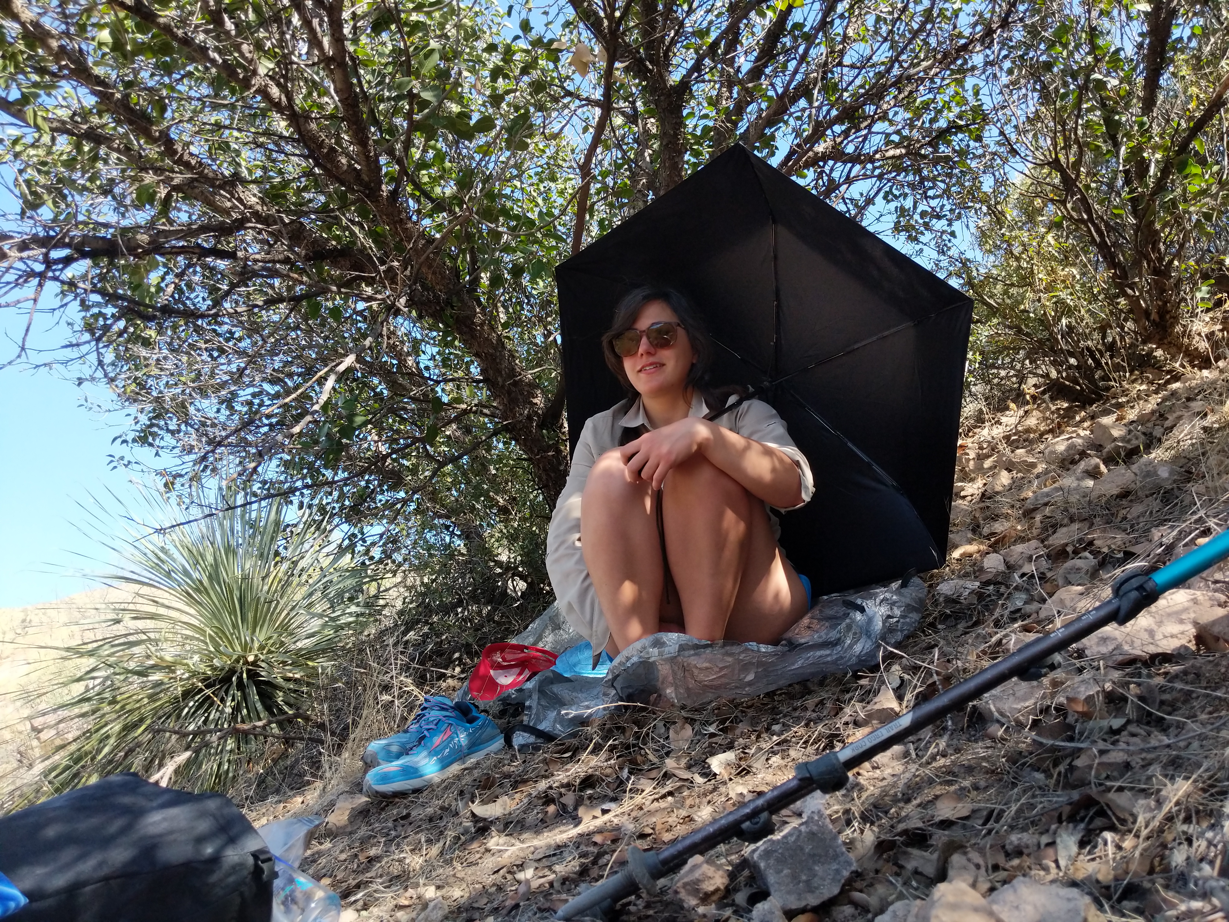 I’ve put on my buff to cover my hair; put up my umbrella to shield myself from the sun, and while I say we should shelter at a campsite around 5.4 miles in, as we climb and climb and climb, I’m wondering if we’ll ever get there.